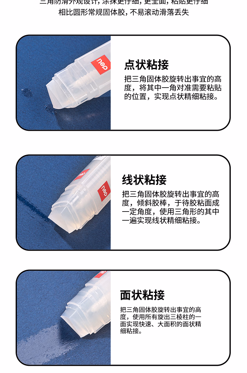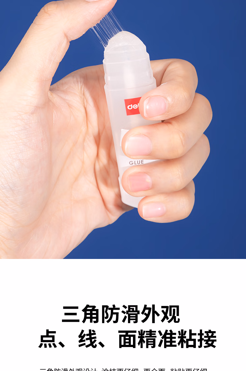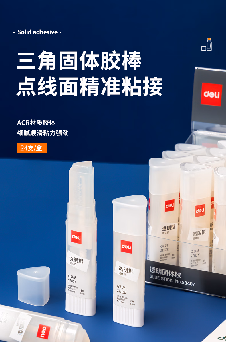 包装清单  :   得力(deli)8gACR三角固体胶水 高粘无甲醛透明胶棒 点线面强力粘接 DIY手工学生文具 单支 办公用品 53407