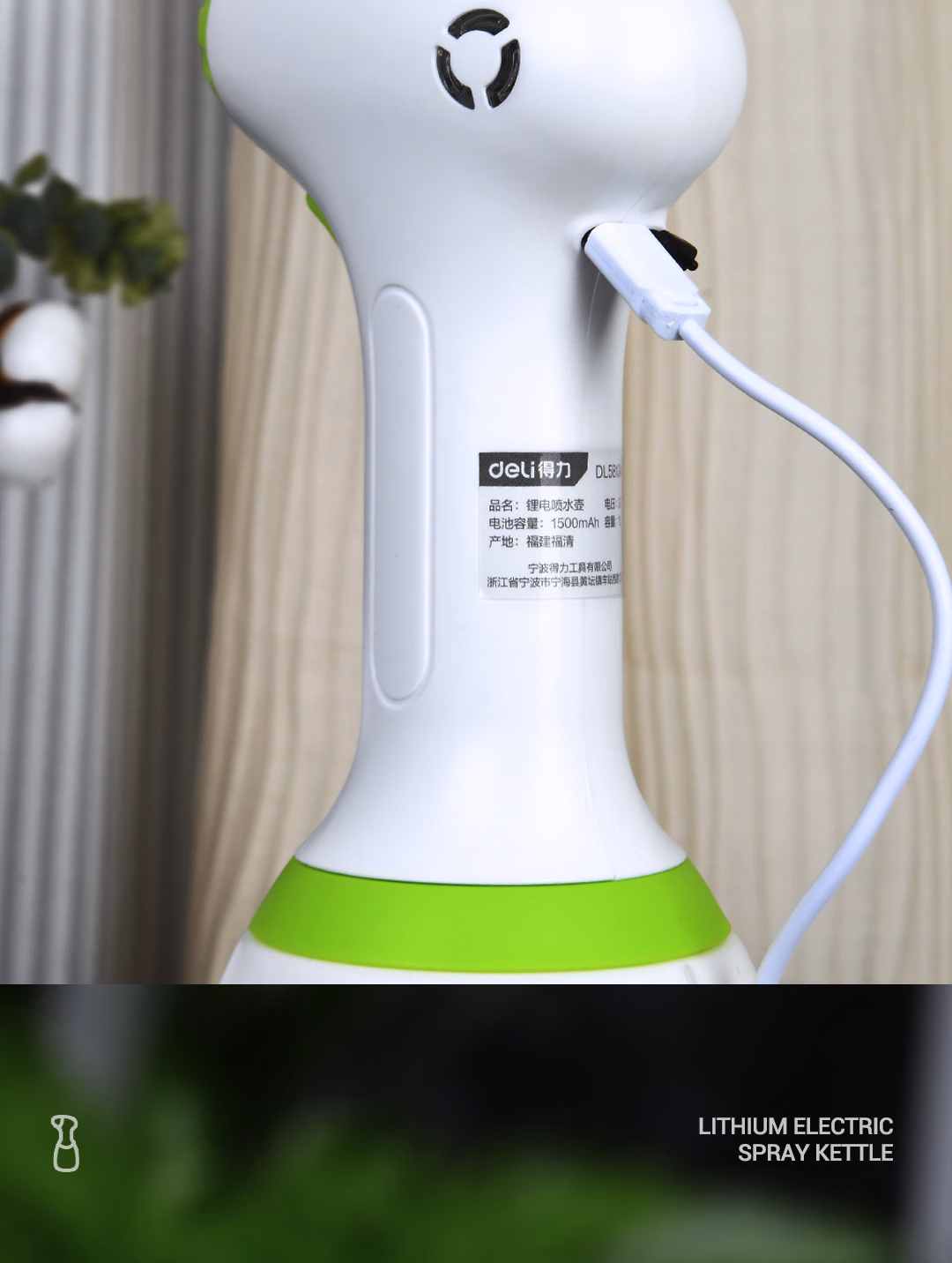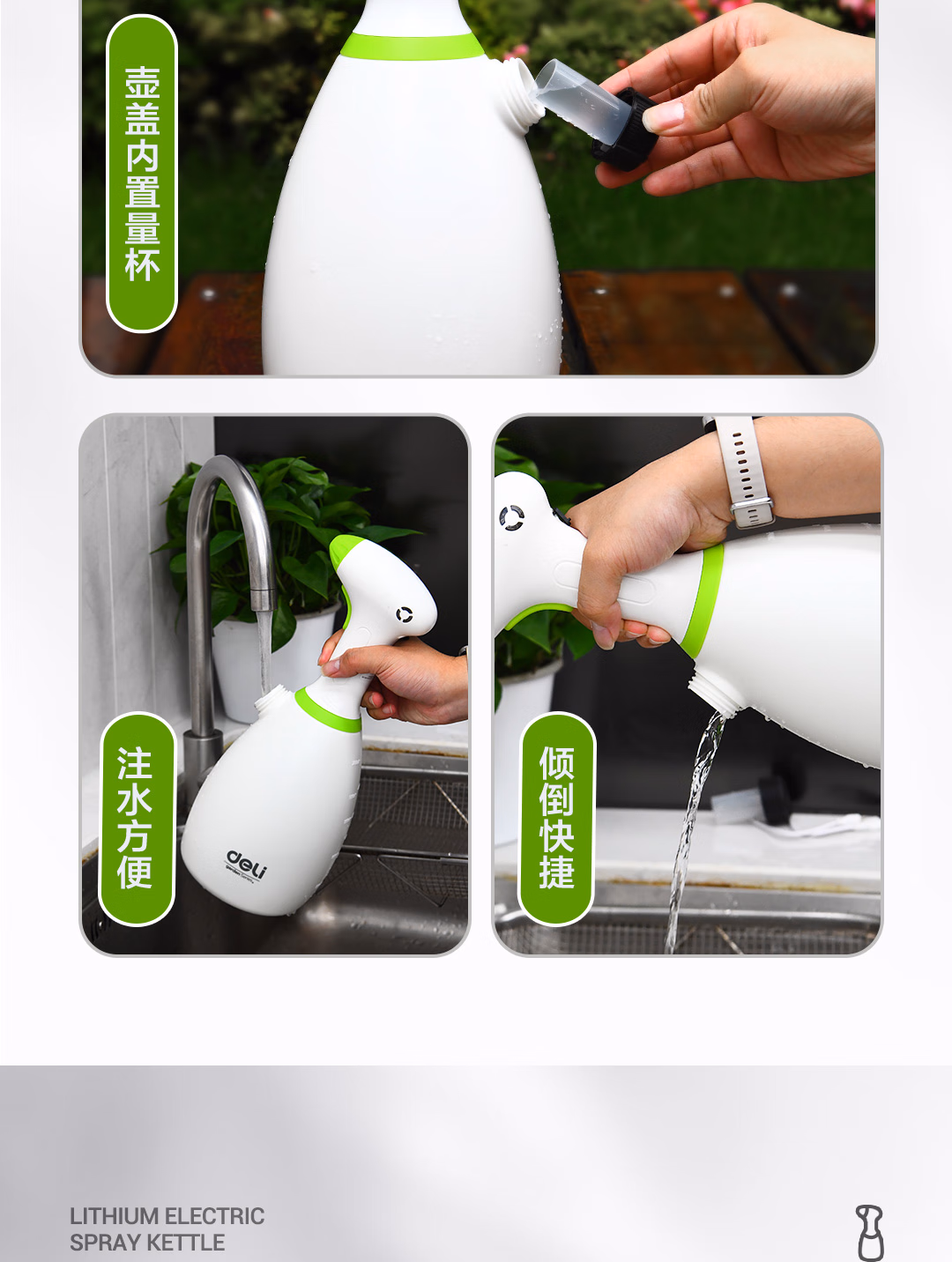 包装清单  :   得力(deli)园艺电动喷水壶2L浇花小型喷雾器自动喷水壶 酒精消毒保洁洗车