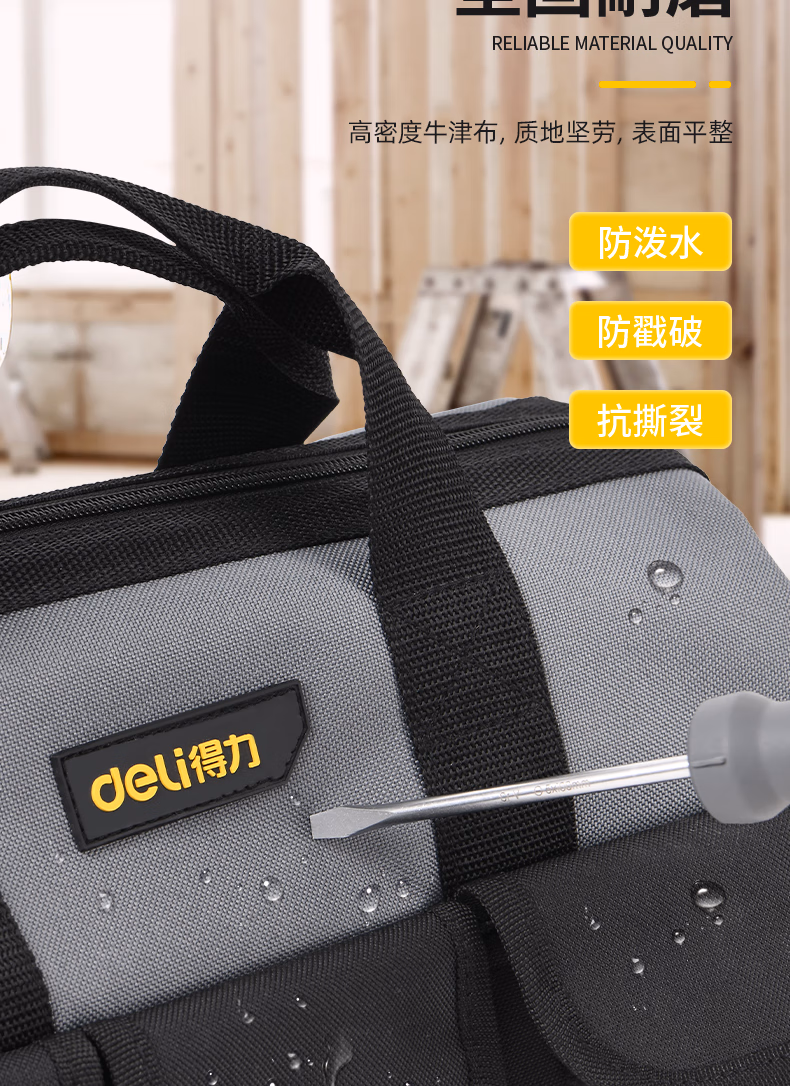 包装清单  :   得力(deli)13寸工具包多功能加厚双层手提包电工维修大容量收纳便携工具布包