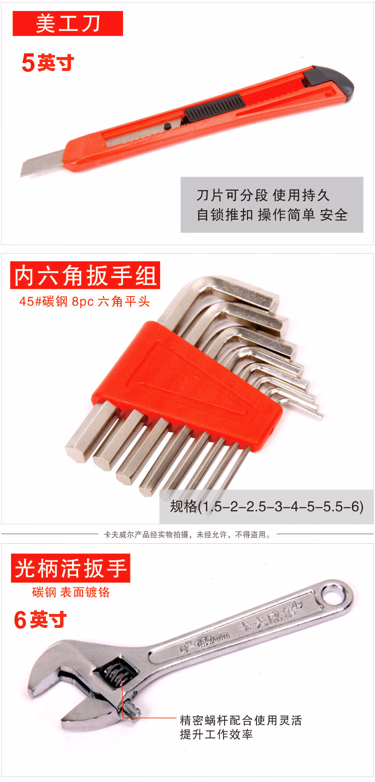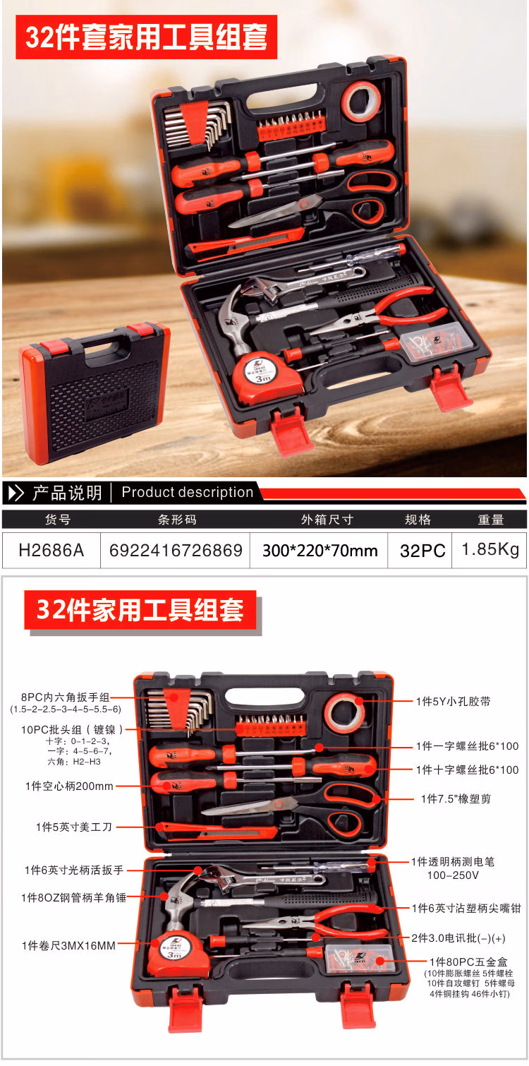 包装清单  :   卡夫威尔 32件家用工具箱套装电讯电工电子维修工具组套五金螺丝刀 H2686A