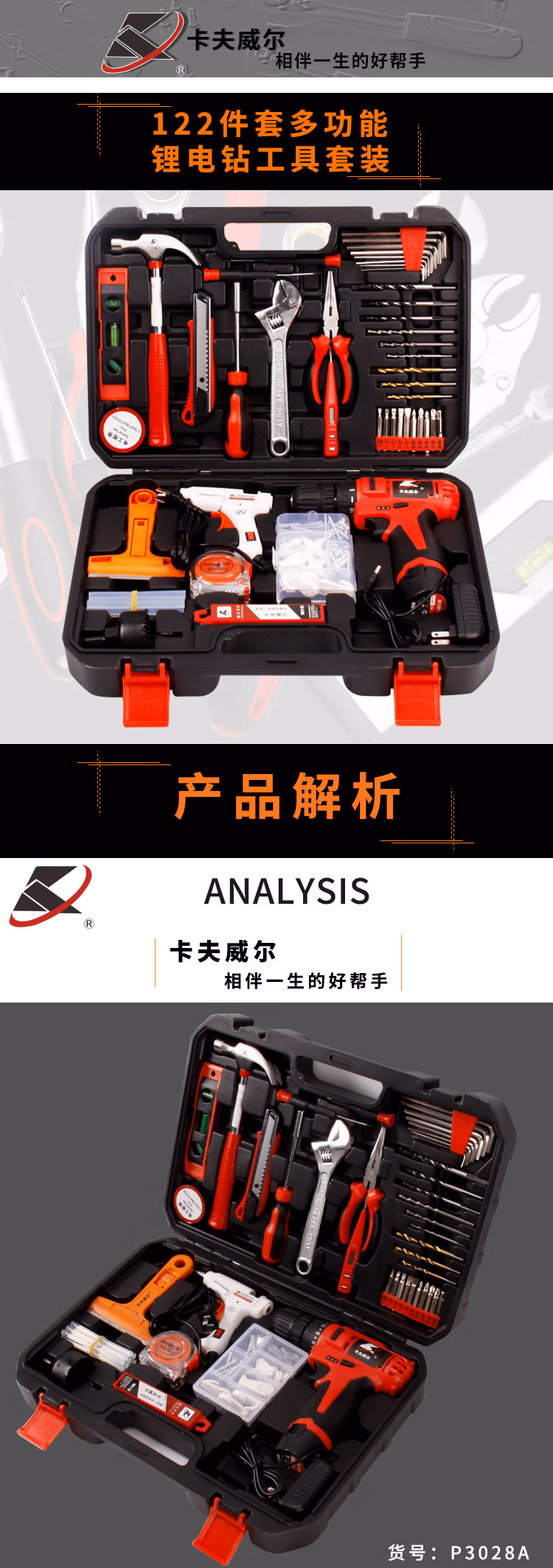 包装清单  :   卡夫威尔 122件套锂电钻套装日常家用工具箱套装手电钻工具组套 P3028A