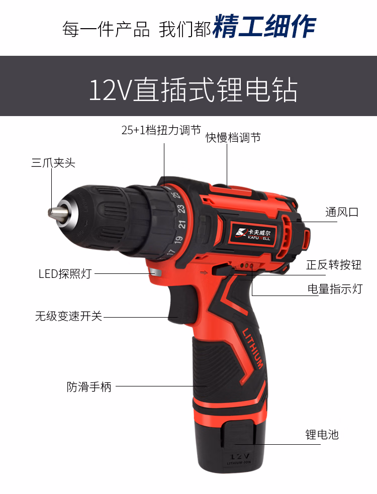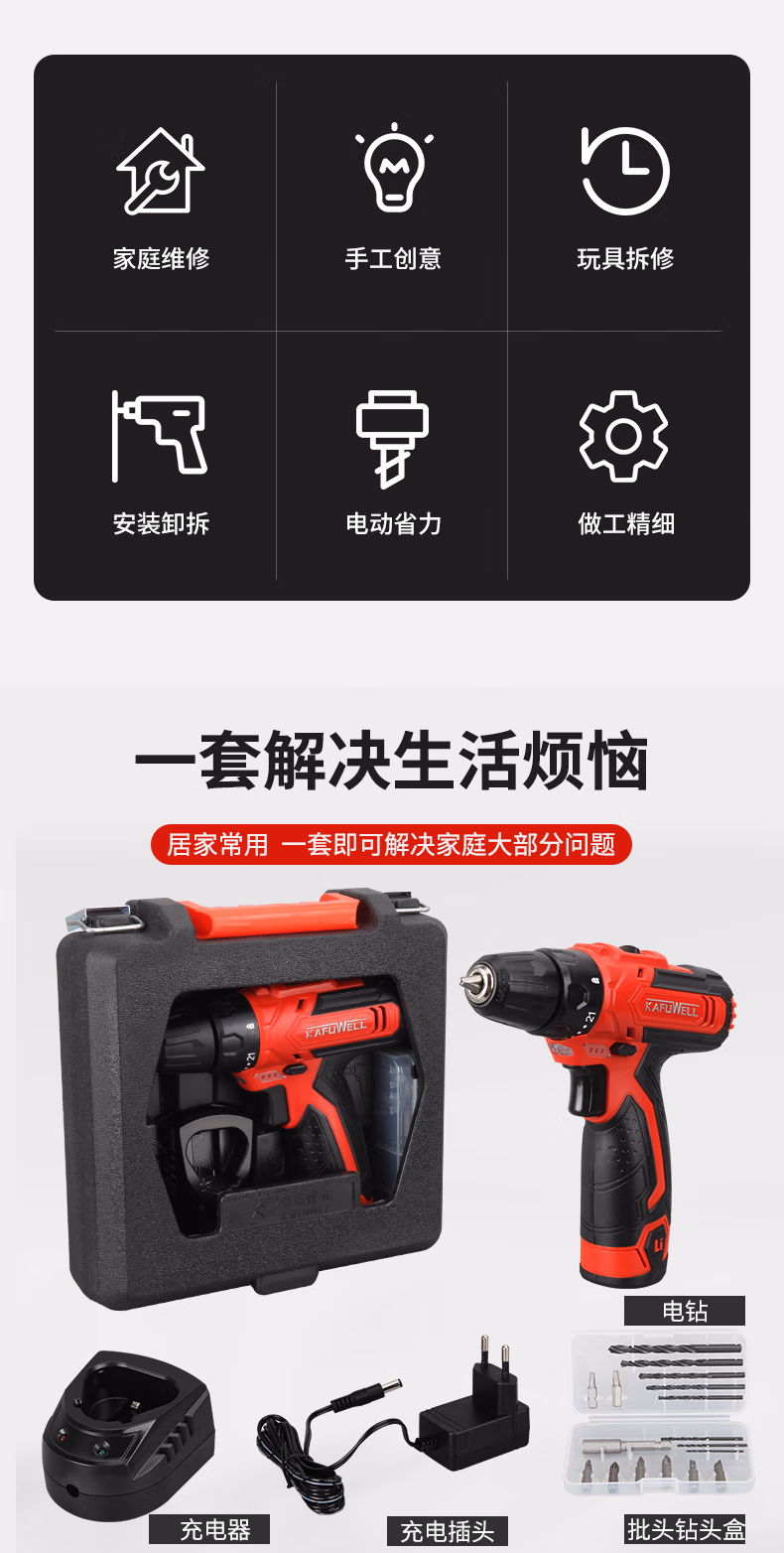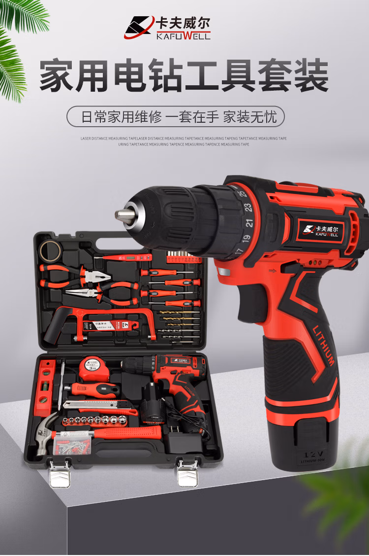 包装清单  :   卡夫威尔126件手电钻工具箱套装家用双电池电动螺丝刀组套五金工具 P3893A