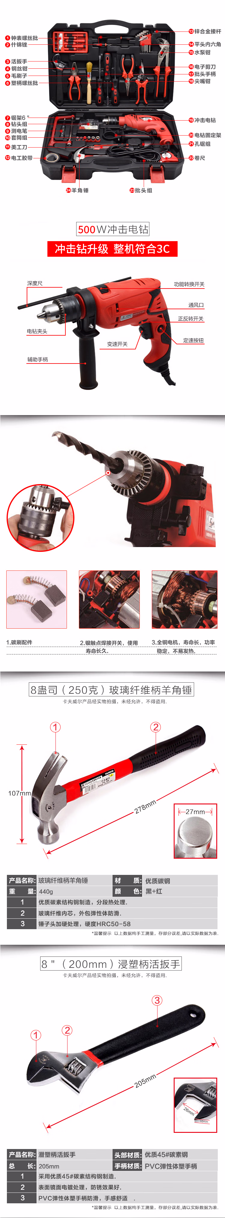 包装清单  :   卡夫威尔500W电钻工具箱套装冲击电钻家用维修工具 94件套 P1044A