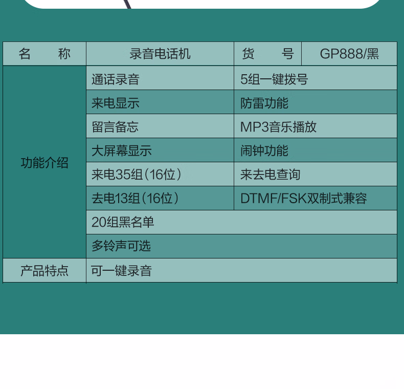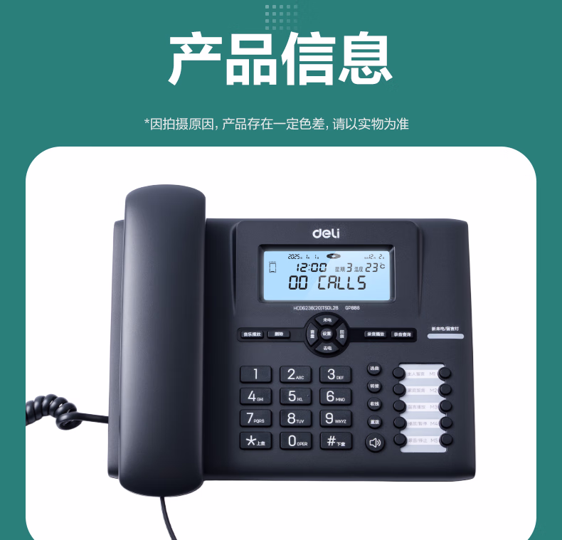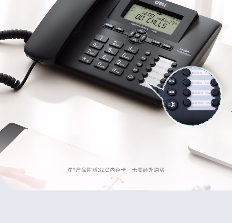 包装清单  :   得力电话机座机 固定电话座机 录音电话机 办公家用 接电脑海量存储 智能屏幕拨打 GP888黑