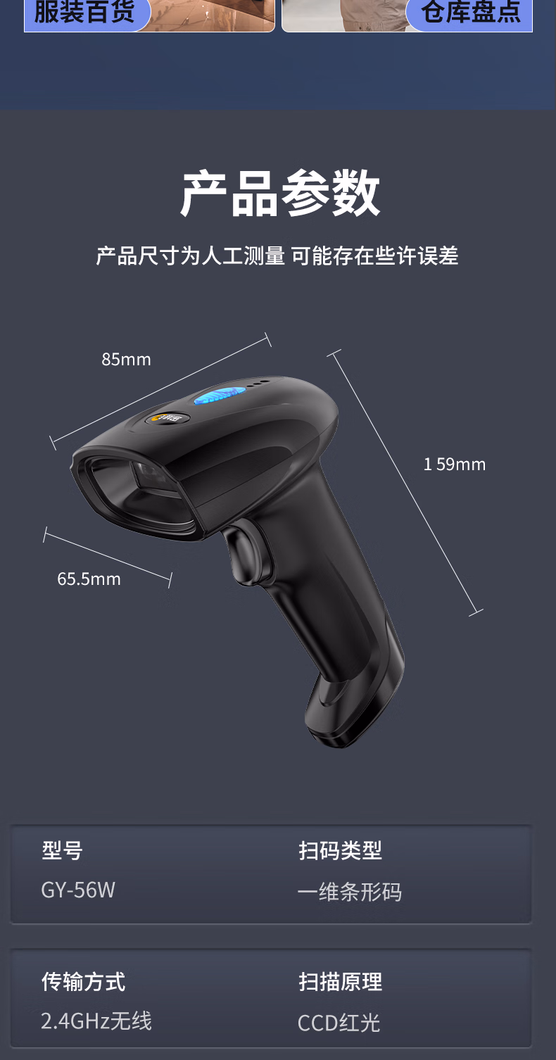 包装清单  :   科密(comet)GY-56W扫码枪 无线扫描条码枪器 药品追溯条码扫描备件仓库物流 快递商品一维码屏幕码