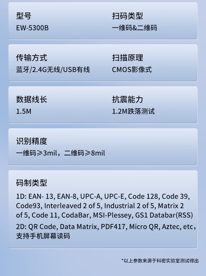 包装清单  :   科密扫码枪 无线蓝牙扫描枪 药品追溯条码扫描器二维码超市收银医保支付 快递物流查询仓库EW-5300B