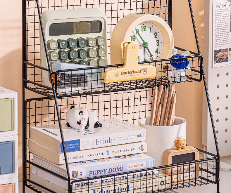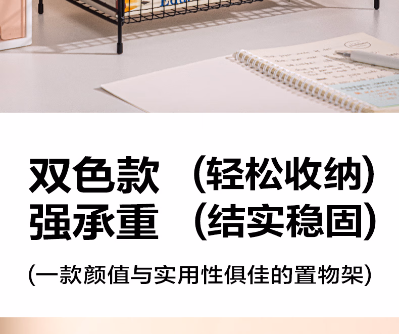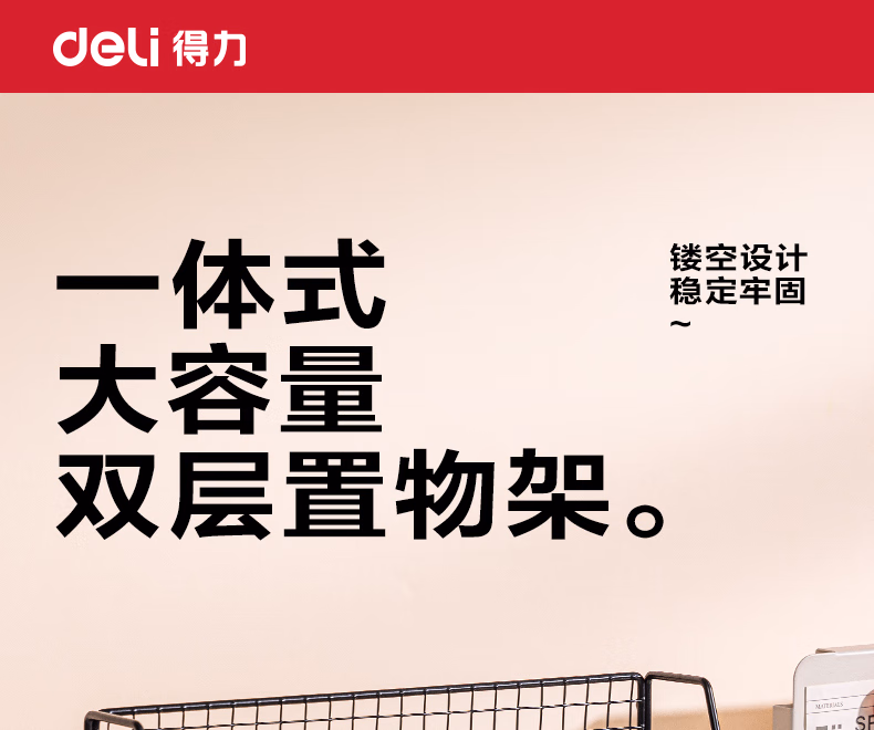 包装清单  :   得力得力(deli)金属双层置物架 防锈铁线 宿舍床头收纳筐 桌上书立 办公室收纳架 PJ105黑