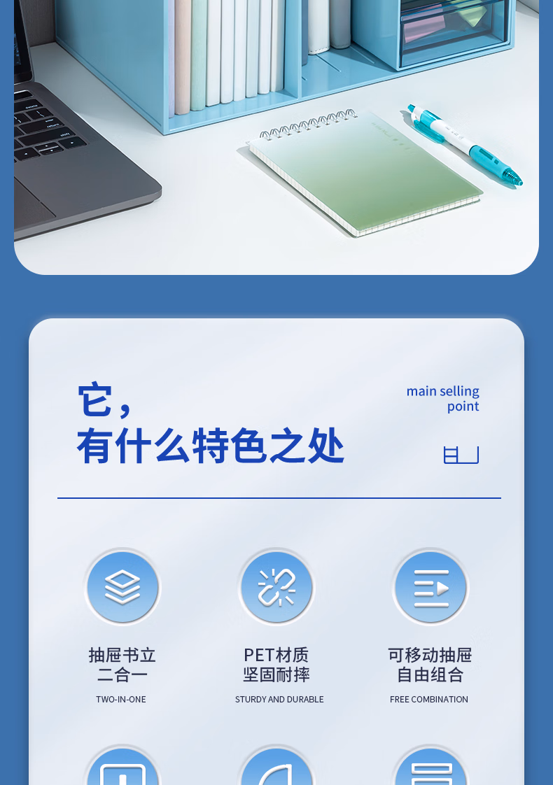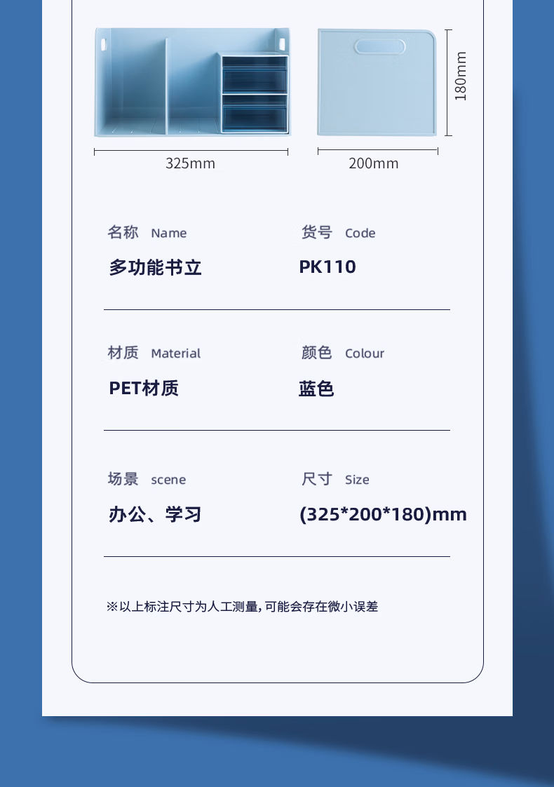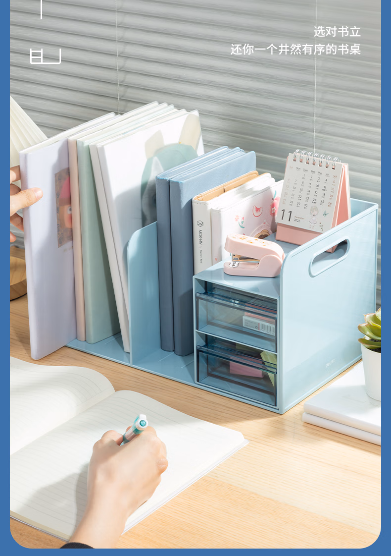 包装清单  :   得力(deli)多功能桌面书立架收纳桌上收纳盒抽屉式置物架书挡学生/办公学习用品蓝色 PK110