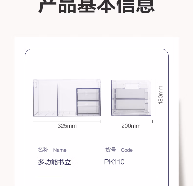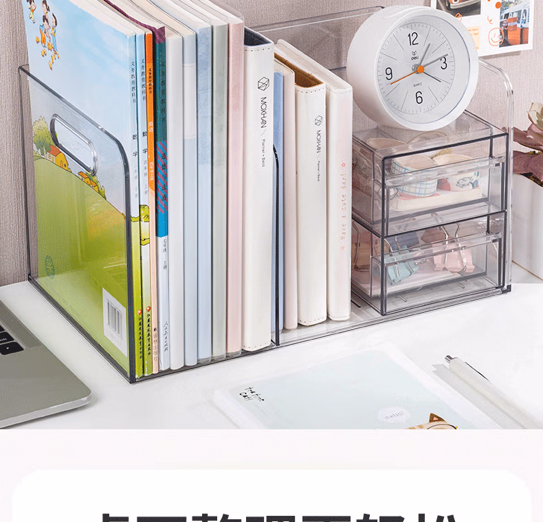 包装清单  :   得力(deli)多功能书立架 创意收纳盒文件框办公室抽屉式置物架书架学生学习用品 透明 PK110