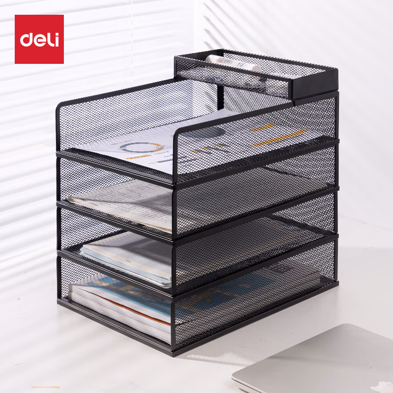包装清单  :   得力(deli)四层竖板金属文件座 办公桌文件架置物架 文件托盘 桌面文件框收纳架 PB266黑