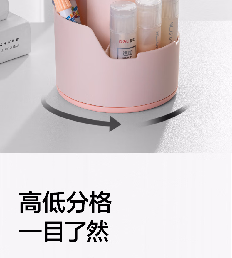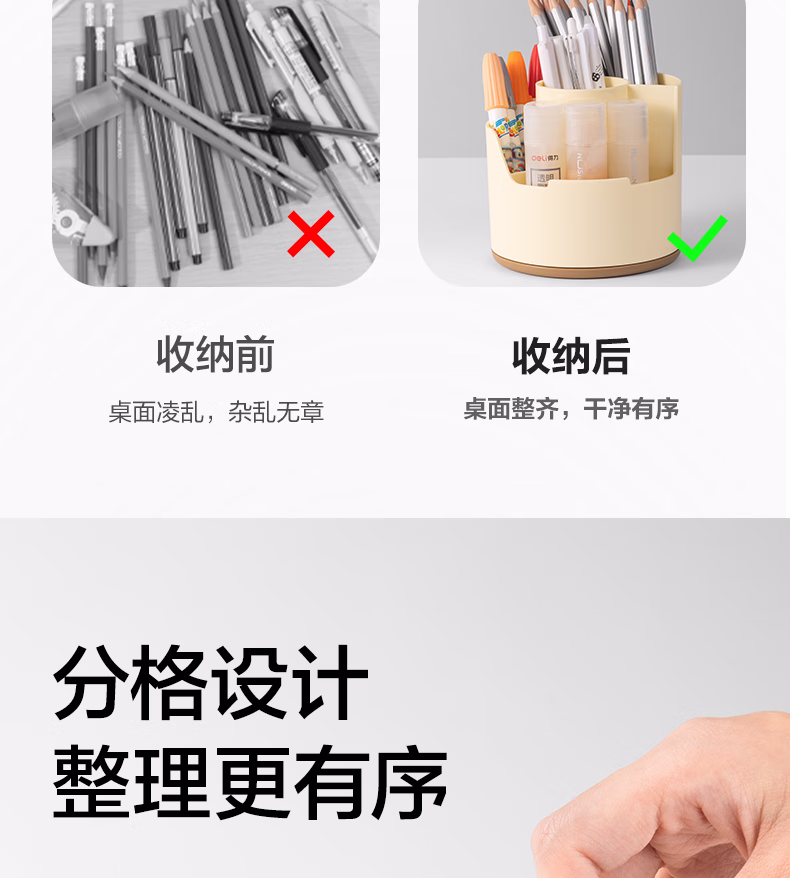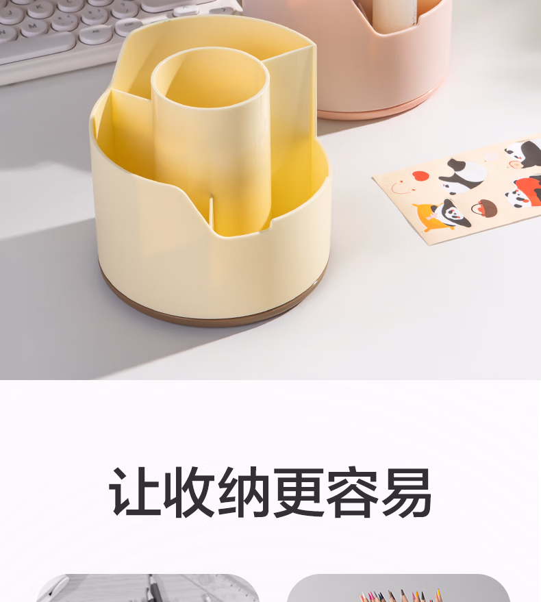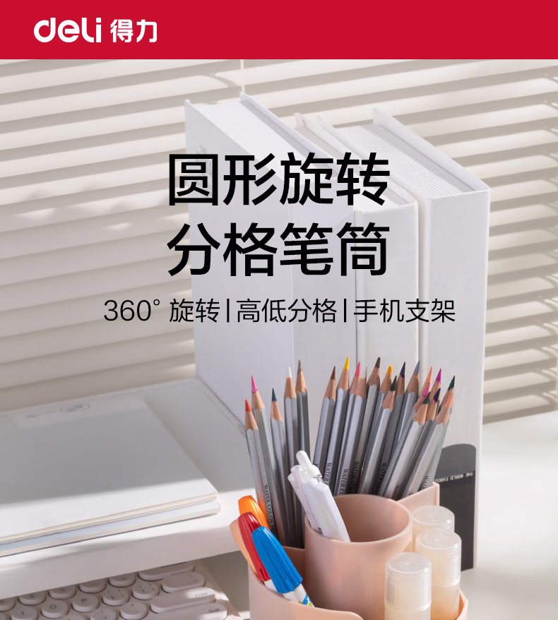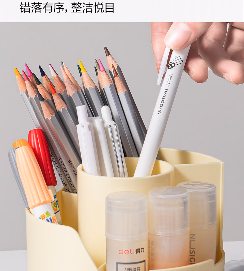 包装清单  :   得力(deli)多功能分格旋转笔筒 大容量桌面收纳盒 手机支架 办公用品 可旋转黄色PK414