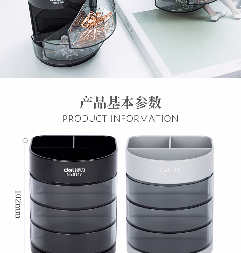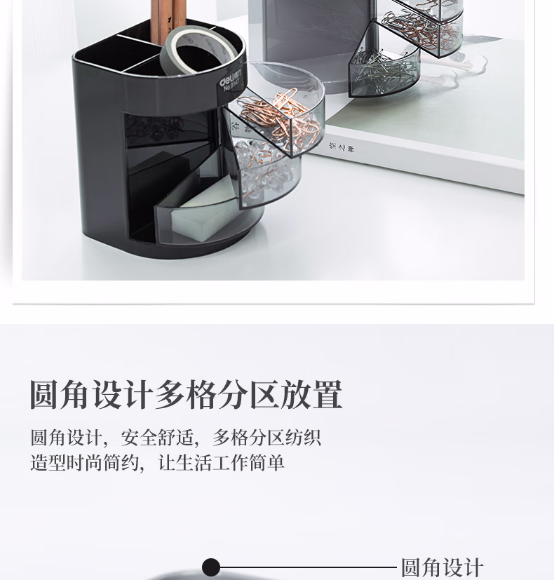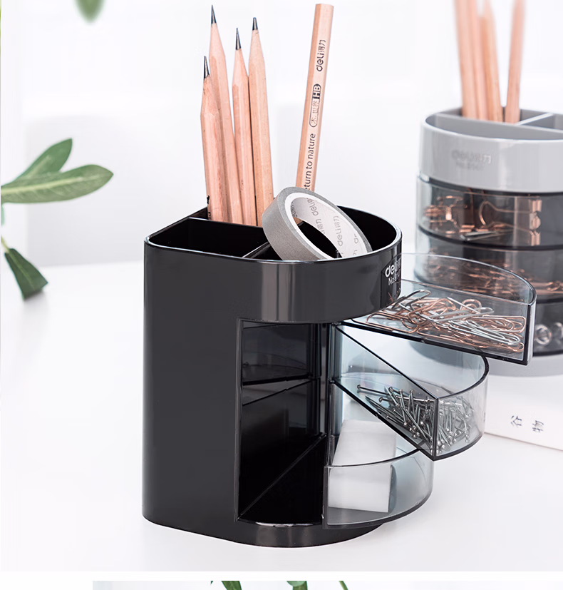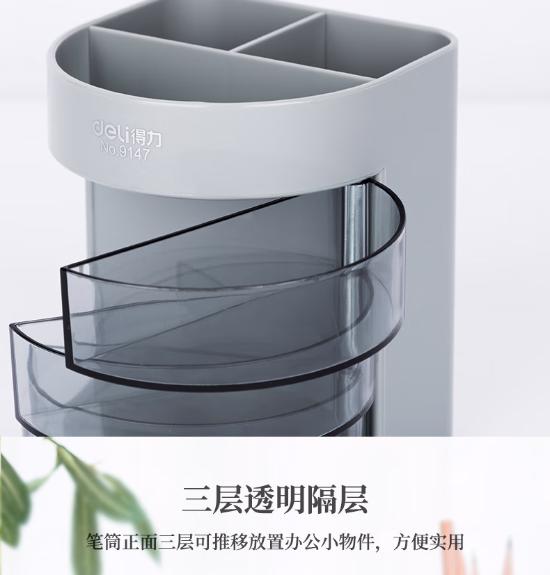 包装清单  :   得力(deli)三层多功能办公笔筒 创意桌面收纳盒 办公学习用品 黑色9147