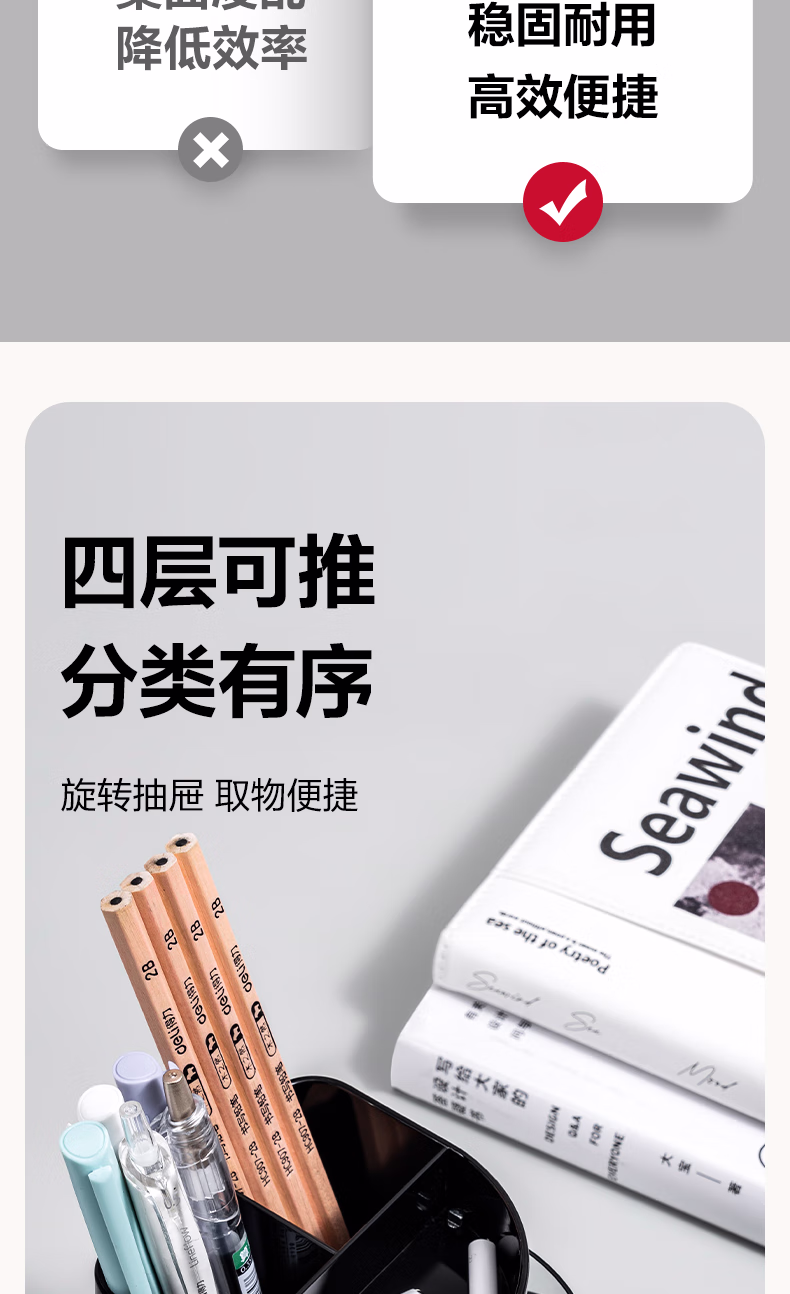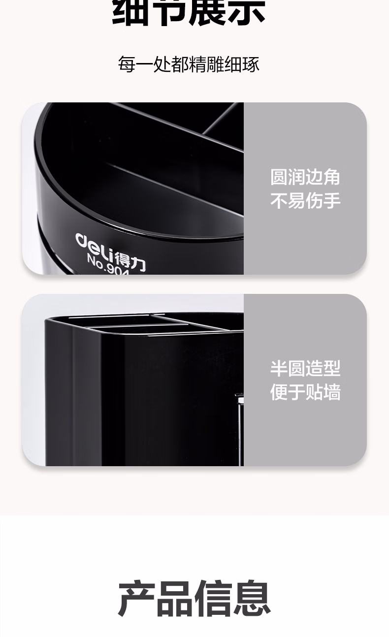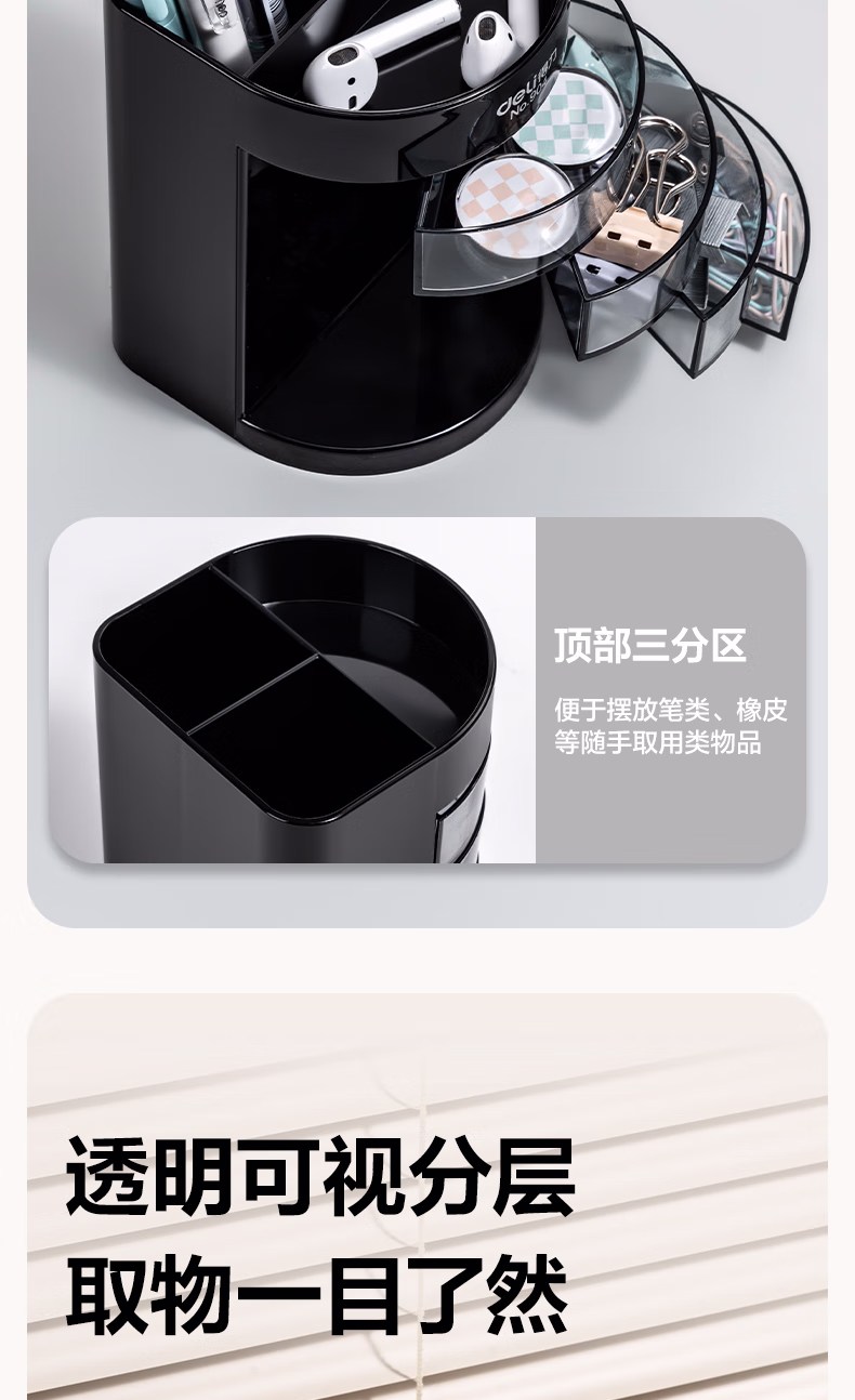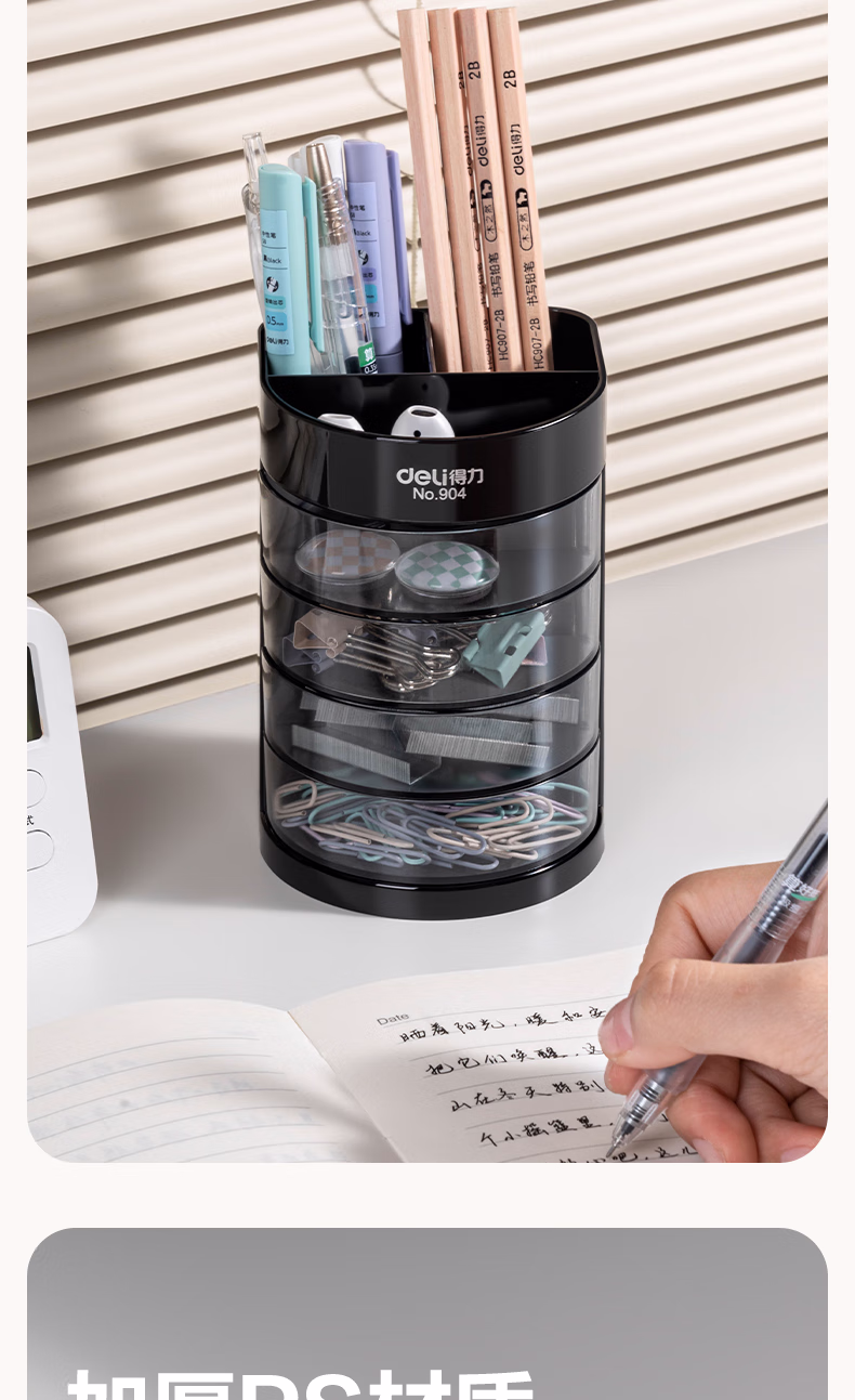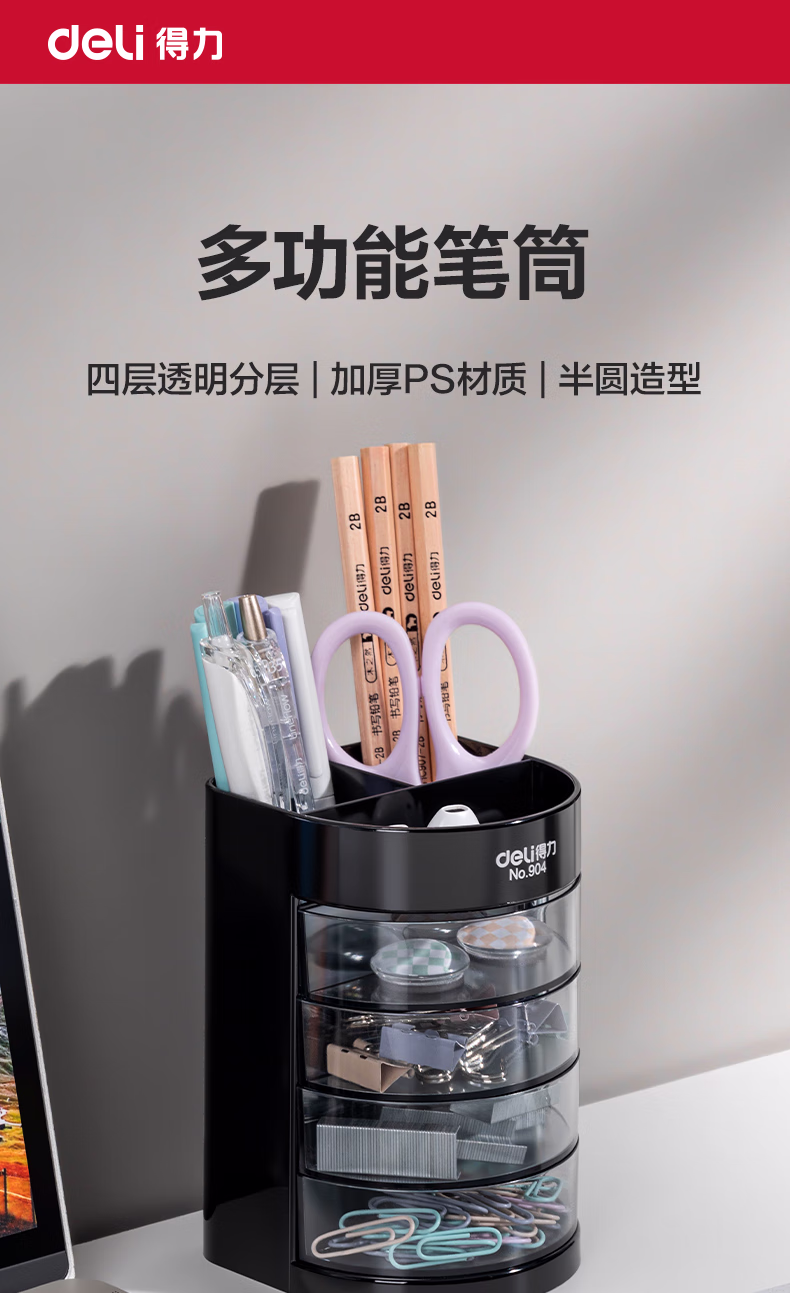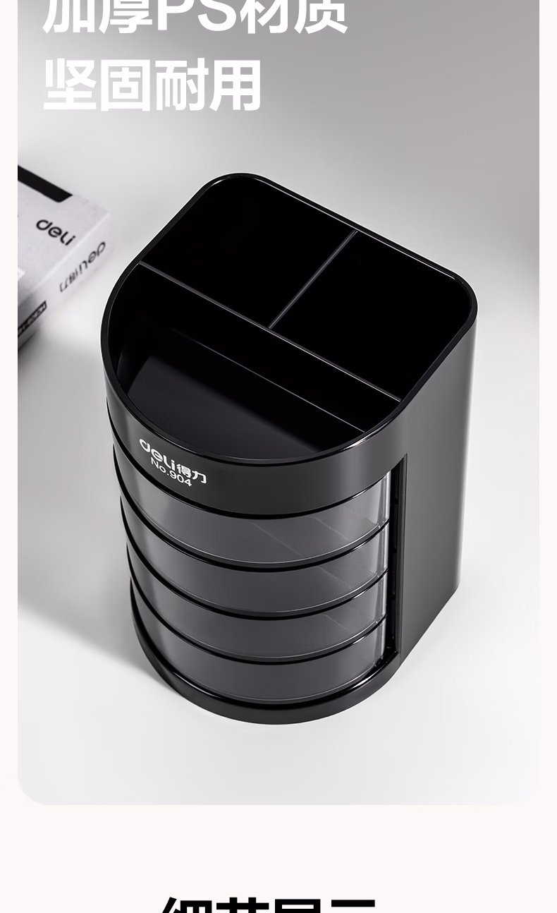 包装清单  :   得力(deli)四层多功能办公笔筒 创意桌面收纳盒 办公用品 黑色904