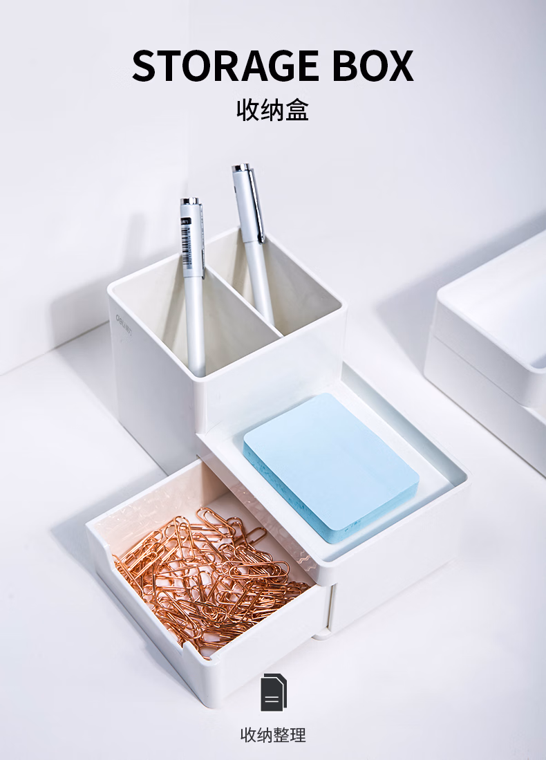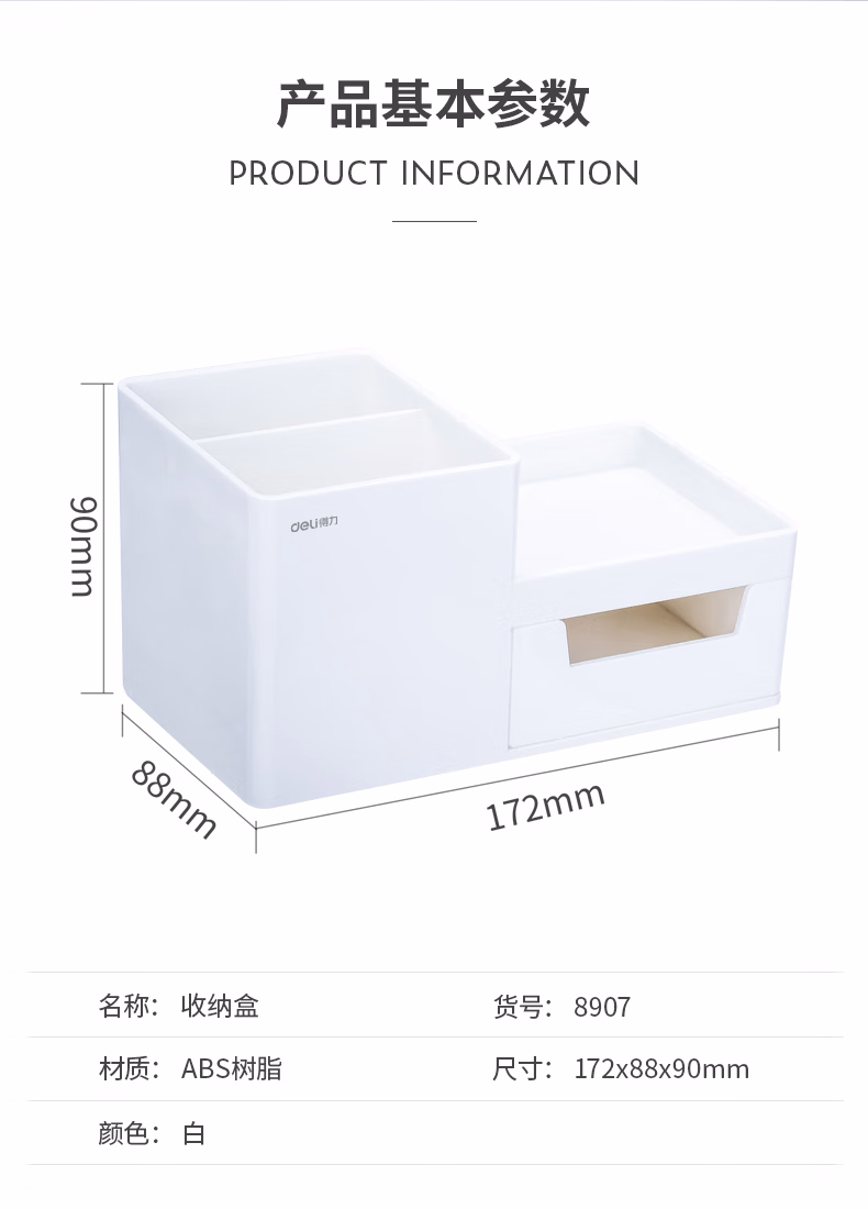 包装清单  :   得力(deli)得力多功能抽屉式笔筒 时尚四层分格收纳盒 加厚学生桌面置物架 8907羊脂白