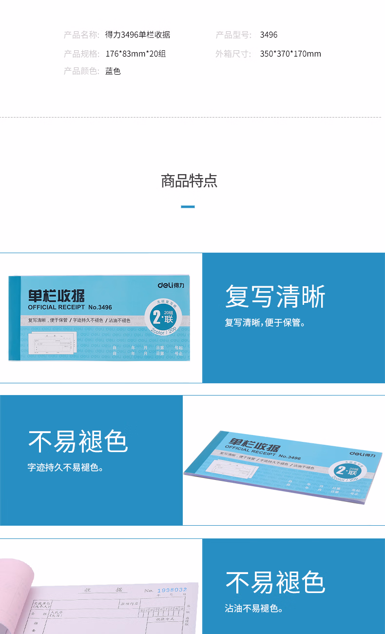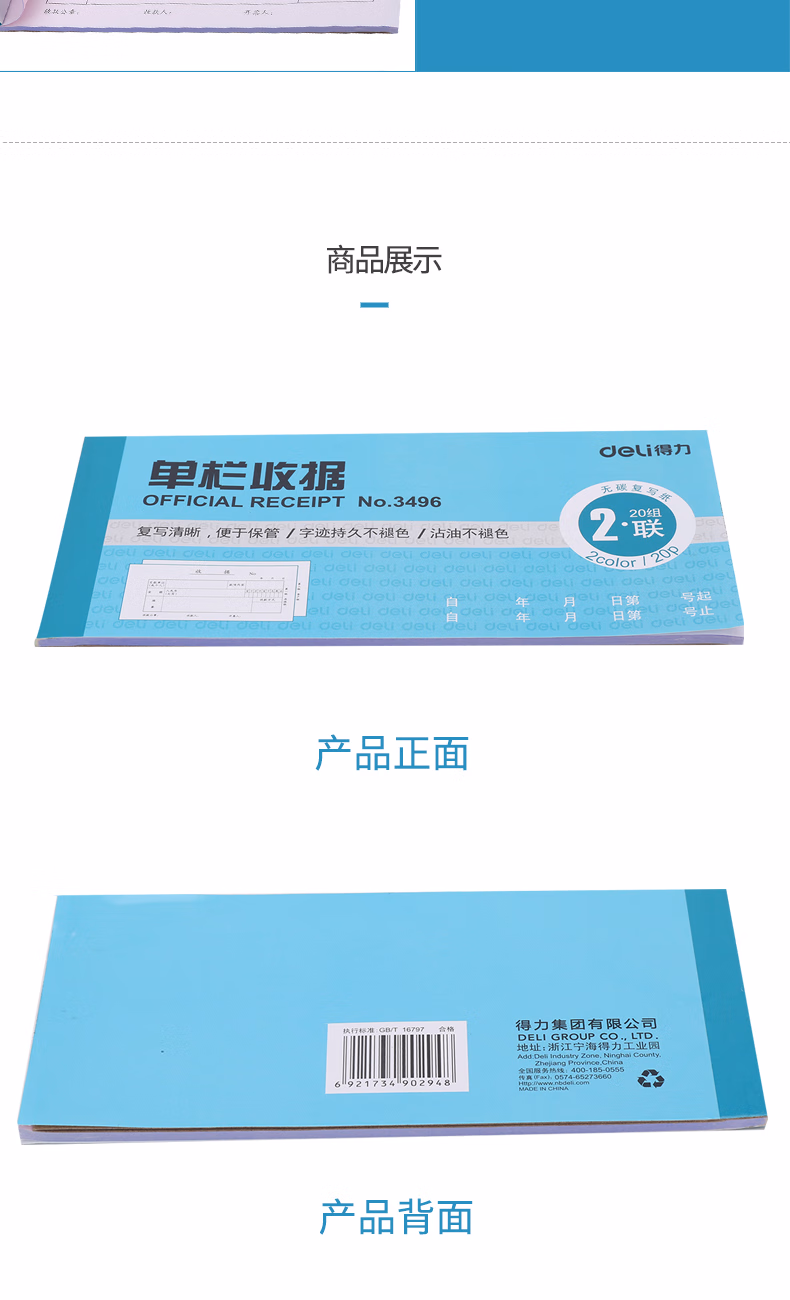 包装清单  :   得力(deli)二联单栏收据 无碳复写单据 财会用品 经济款10本装3496