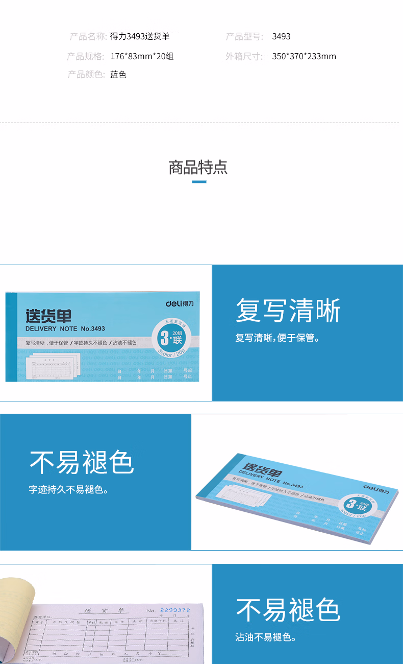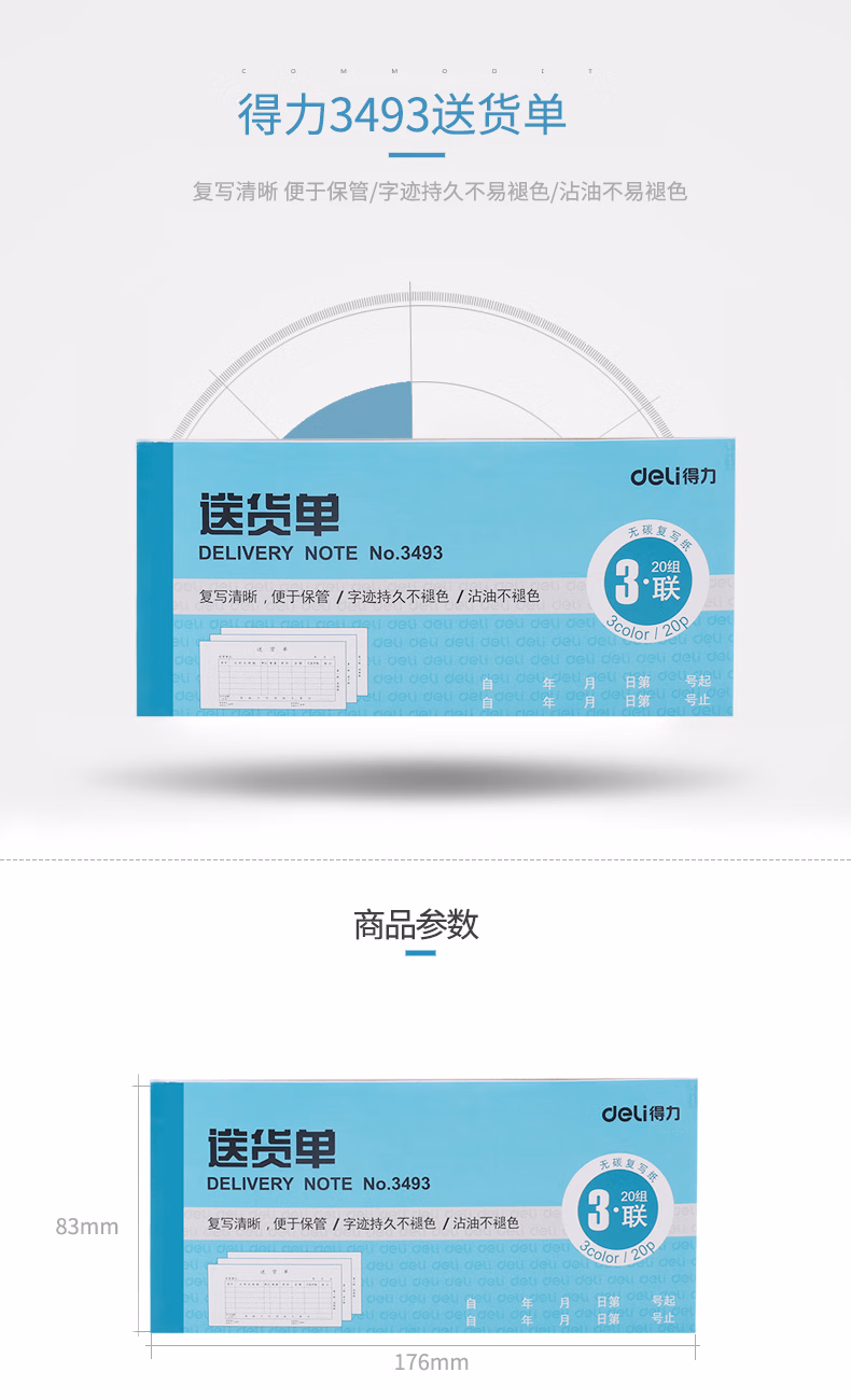 包装清单  :   得力(deli)三联横版送货销货清单 无碳复写单据 财会用品 经济款10本装3493