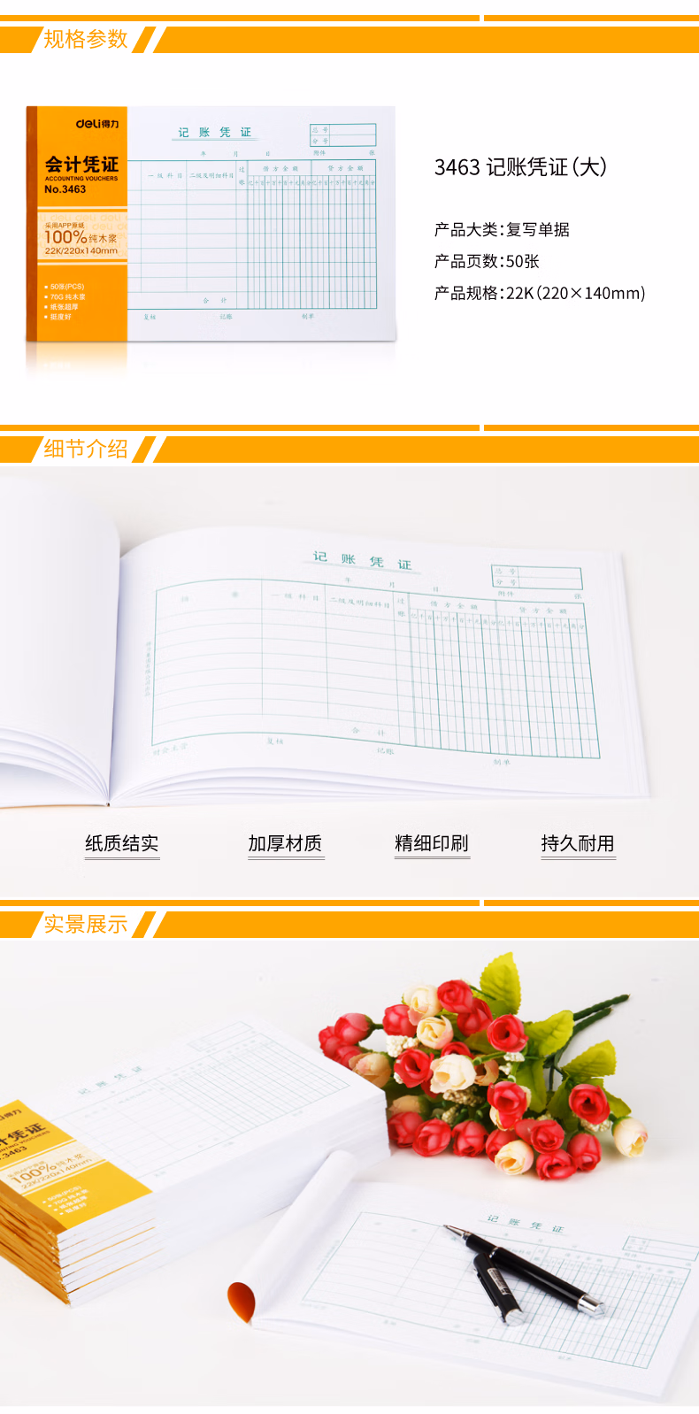 包装清单  :   得力(deli)十本装22K记账凭证 50张/本220*140mm 记账凭证单据票据 通用空白凭证纸 办公用品 3463
