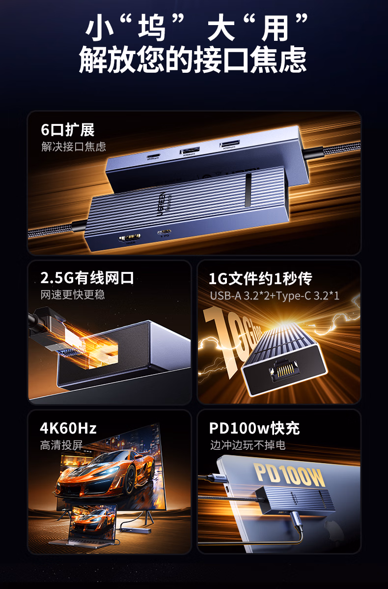 包装清单  :   绿联Type-C3.2鳍纹扩展坞2.5G有线网口转换HDMI转接器4K60Hz高清投屏适用苹果MacBook/Macmini华为联想