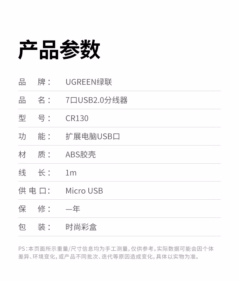 包装清单  :   绿联USB扩展器 高速拓展7口2.0HUB分线器延长线 台式机笔记本电脑扩展坞一拖七多接口转换器带供电口
