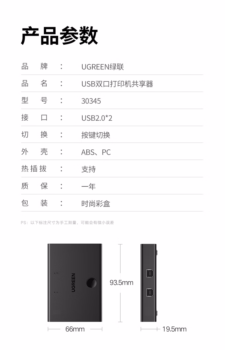 包装清单  :   USB打印机共享器分线器一分二 二进一出切换器 台式机笔记本电脑共享2口转换器一拖二/2进1出30345