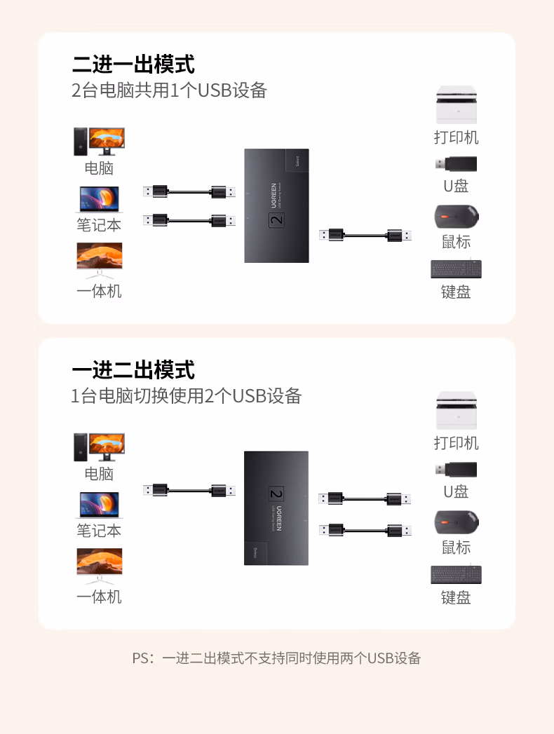 包装清单  :   USB3.0共享切换器二进一出 2进1出两台笔记本台式电脑共享键盘鼠标打印机U盘硬盘对拷互传15149