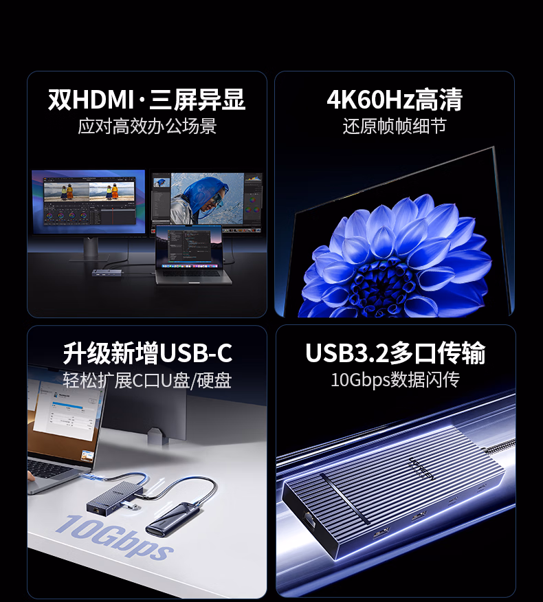 包装清单  :   Type-C3.2双HDMI三屏异显扩展坞USB-C雷电4/5拓展坞10G多功能转接器4K60Hz多屏扩展适用华为电脑