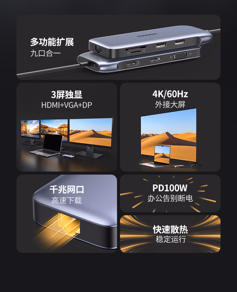 包装清单  :   Type-C三屏异显扩展坞USB-C转DP/HDMI多屏雷电4拓展坞4K60Hz投屏网口充电通用华为笔记本荣耀电脑