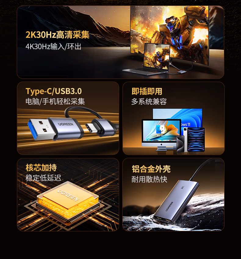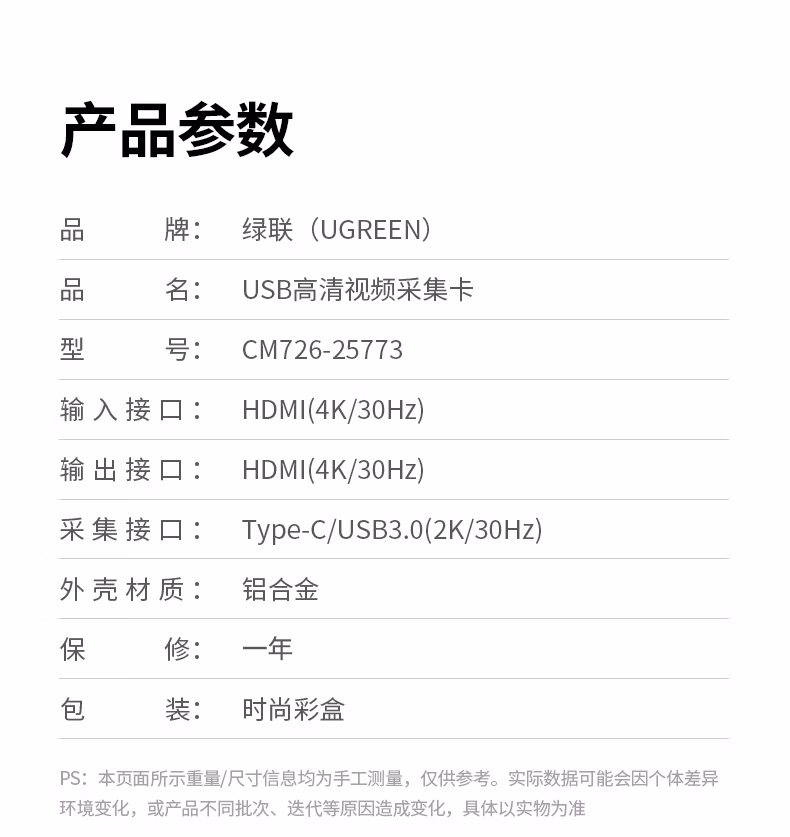 包装清单  :   HDMI高清视频采集卡4K环出 适用相机Switch/PS5手机平板电脑游戏抖音直播录制 转USB3.0/Type-C