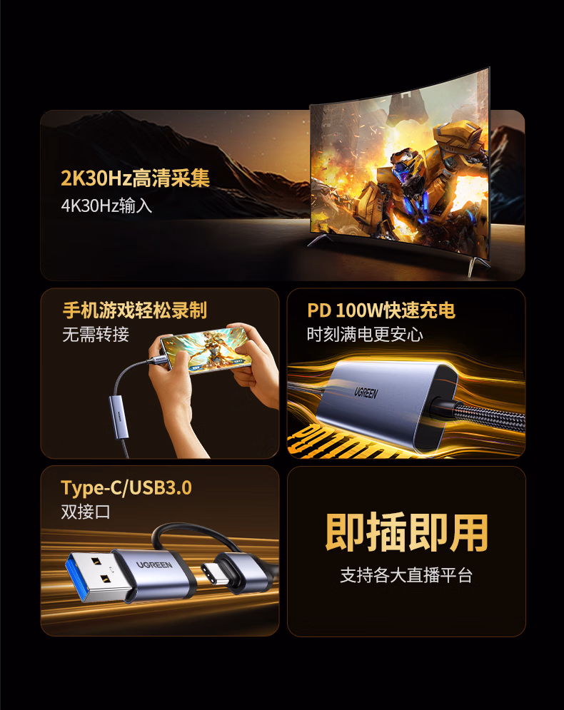 包装清单  :   视频采集卡4K高清输入MS2130适用Switch投屏线便携底座PS5手机平板抖音直播录制 转USB3.0/Type-C