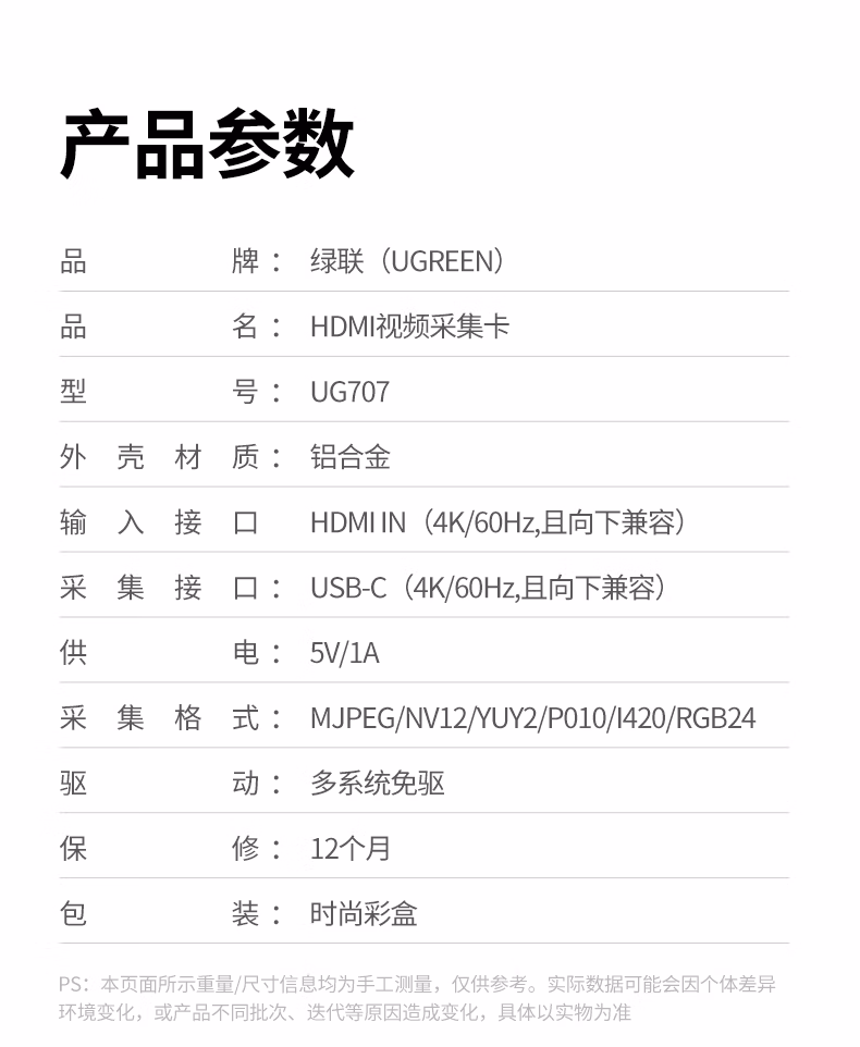 包装清单  :   HDMI视频采集卡4K60Hz高清RGB24 适用Switch2/PS5尼康索尼佳能相机手机ipad平板电脑游戏直播录制