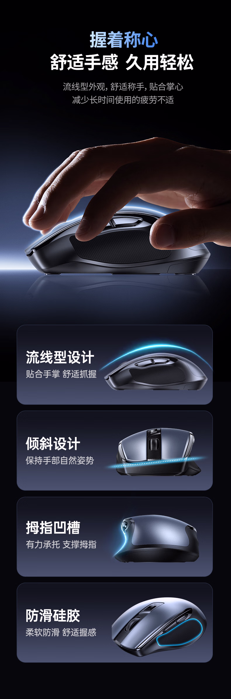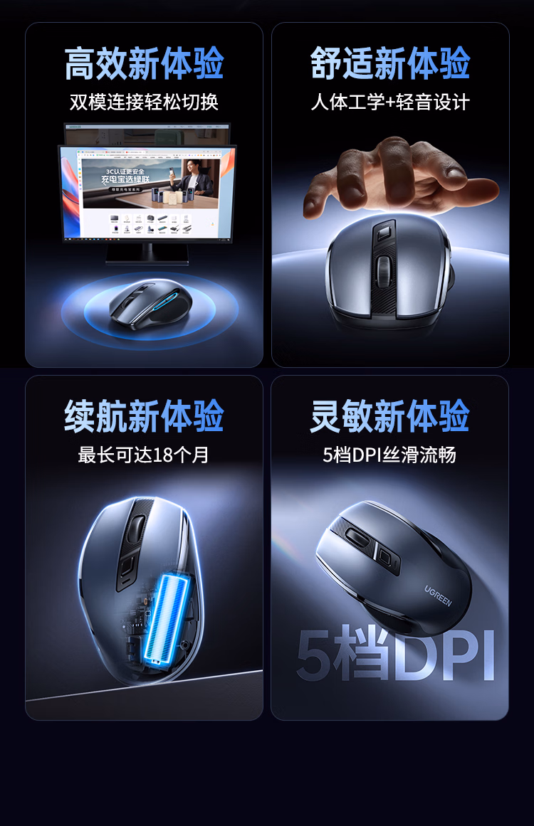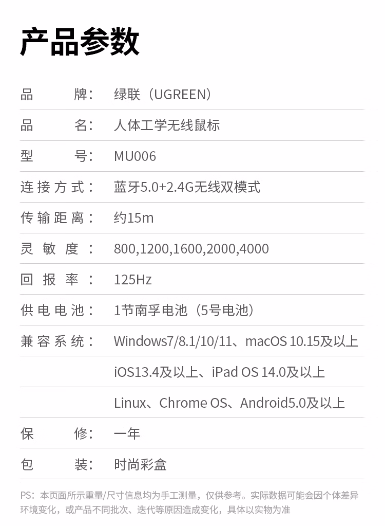 包装清单  :   绿联无线蓝牙双模鼠标 办公轻音鼠标 适用苹果Mac华为Mate笔记本iPad平板 按键可自定义人体工学鼠标