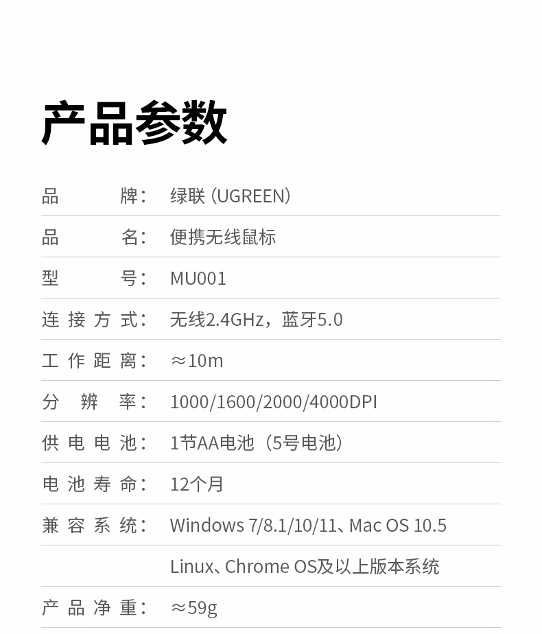 包装清单  :   绿联无线蓝牙双模鼠标 适用苹果Mac华为Matebook笔记本电脑iPad平板鼠标 超薄便携轻音办公鼠标