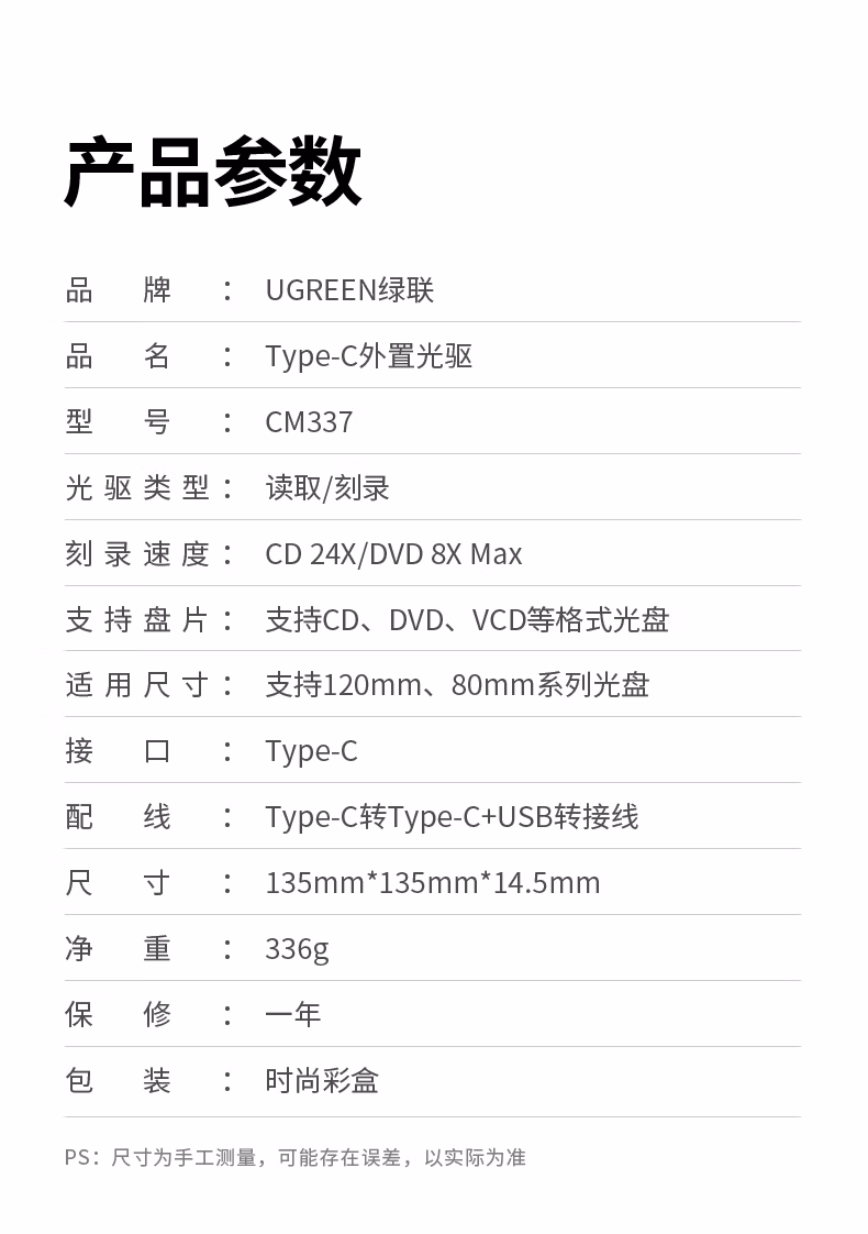 包装清单  :   绿联8倍速Type-C/USB外置光驱移动刻录机便携读刻一体 笔记本电脑外接DVD/CD光盘播放高速读取器80130