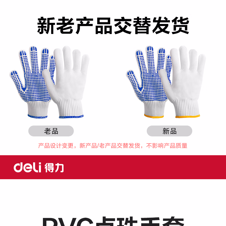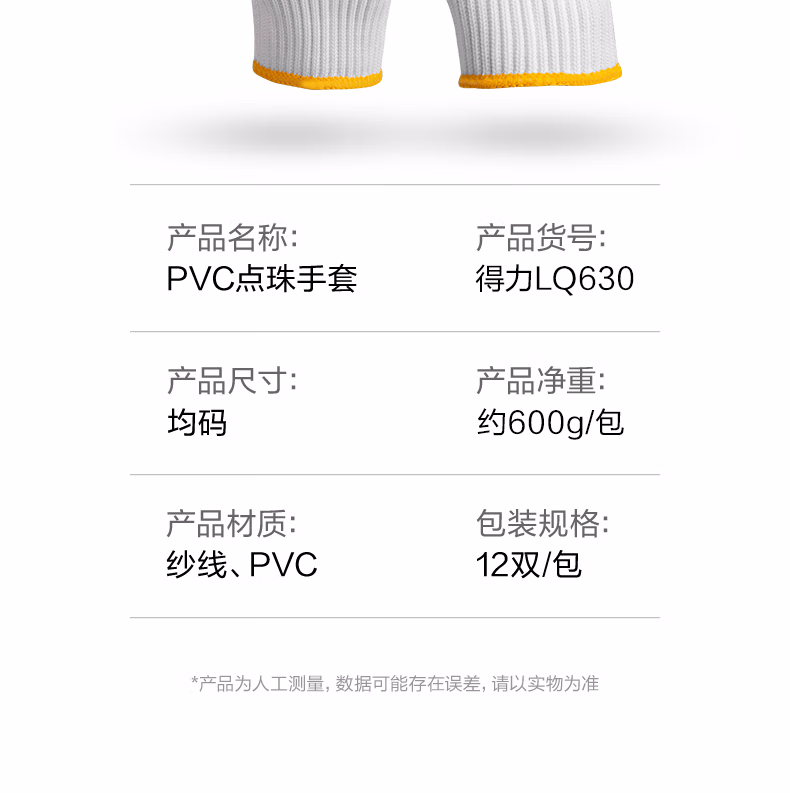 包装清单  :   得力(deli) 劳保手套LQ630点胶防滑耐磨线手套点珠12双/包12付