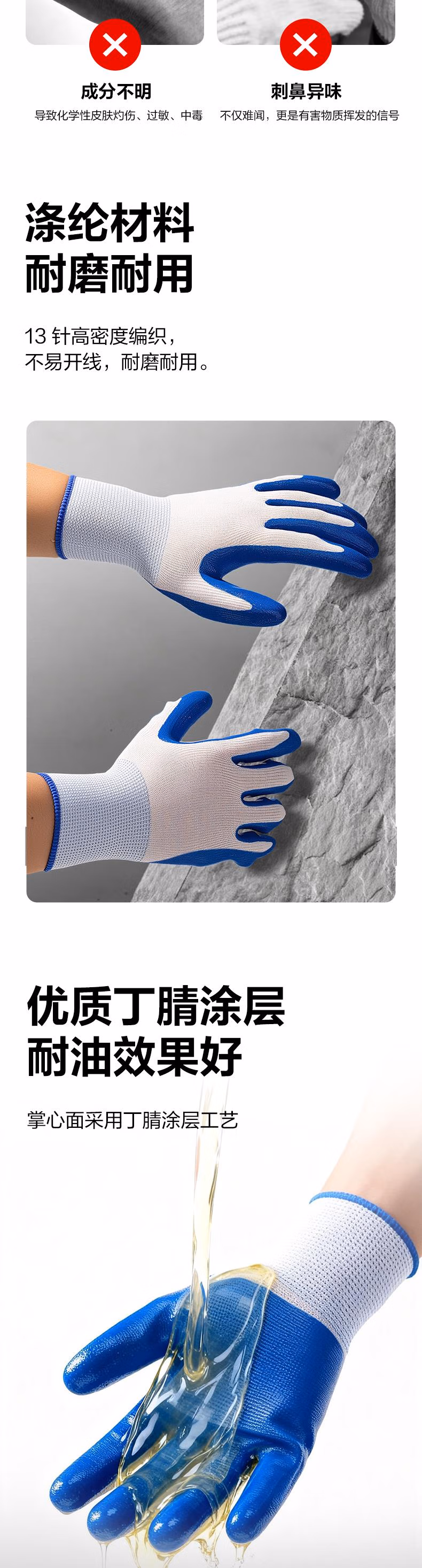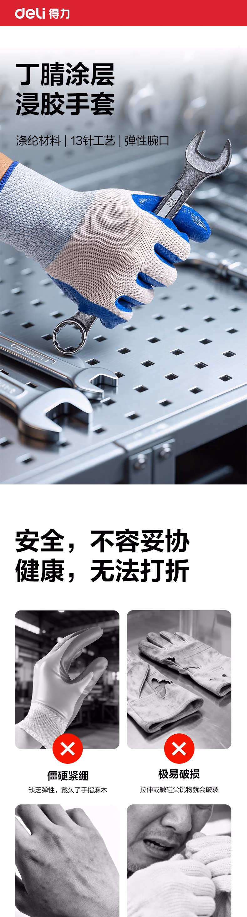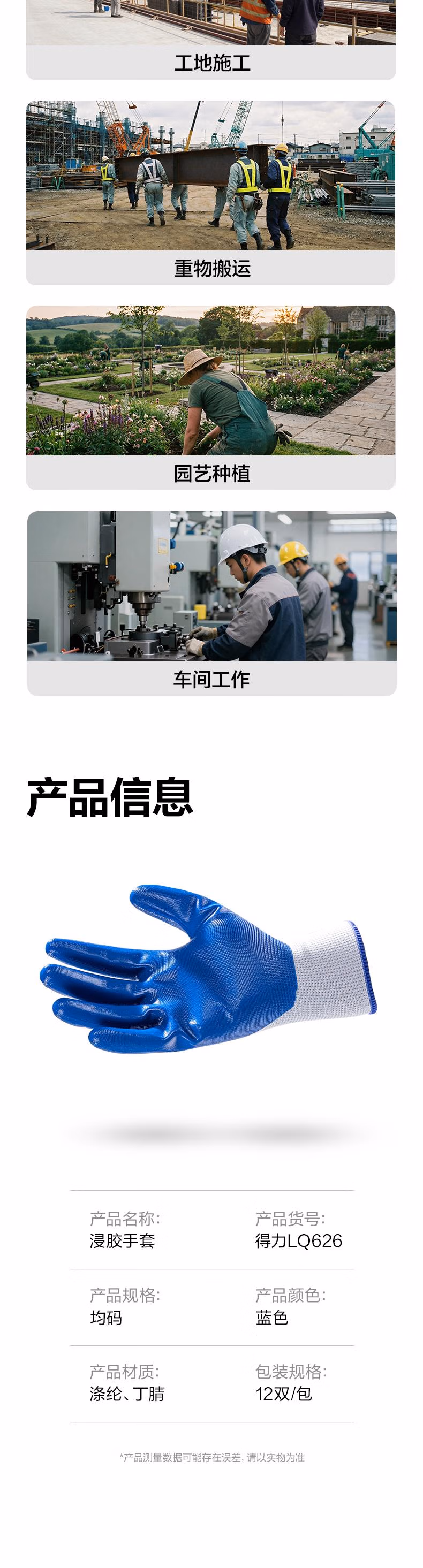 包装清单  :   得力(deli)浸胶劳保手套 丁腈橡胶耐磨防滑胶皮 工地干活工作防护 LQ626 蓝