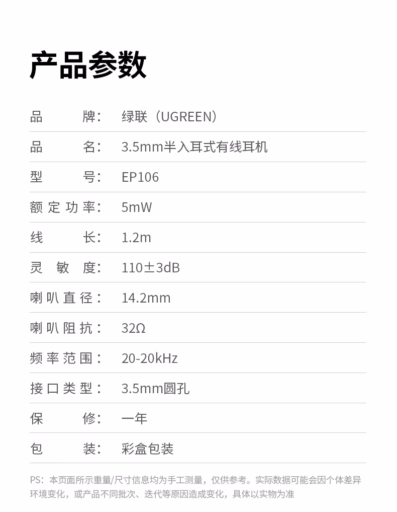 包装清单  :   绿联有线耳机半入耳式3.5mm接口耳机