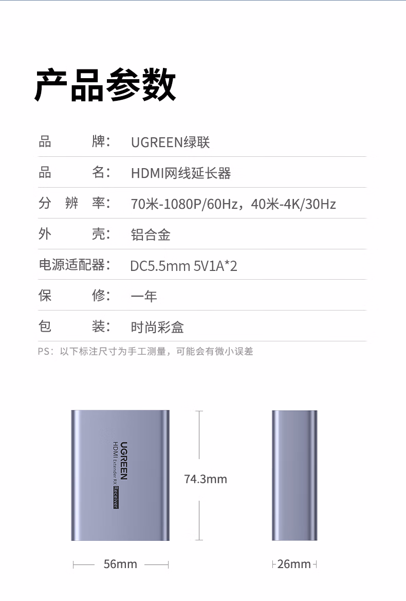 包装清单  :   HDMI延长器40米/4K 70米/1080P RJ45转hdmi网传单网线传输器 网络高清视频信号放大器一对装20519