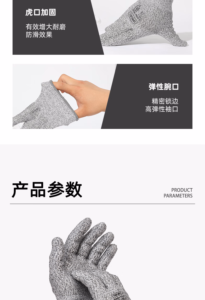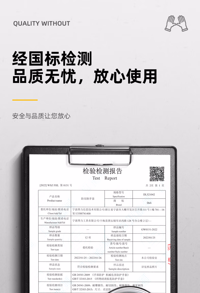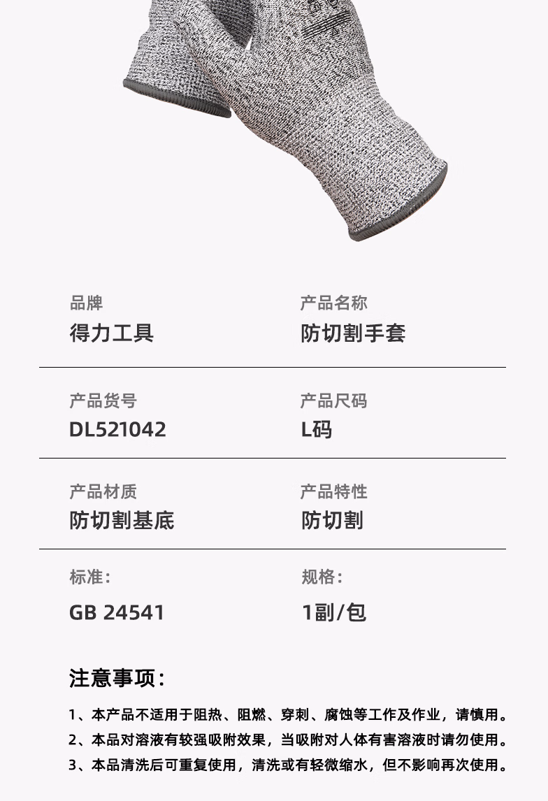 包装清单  :   得力(deli)防切割手套加厚耐磨防油污木工防刺防扎防割伤 灰