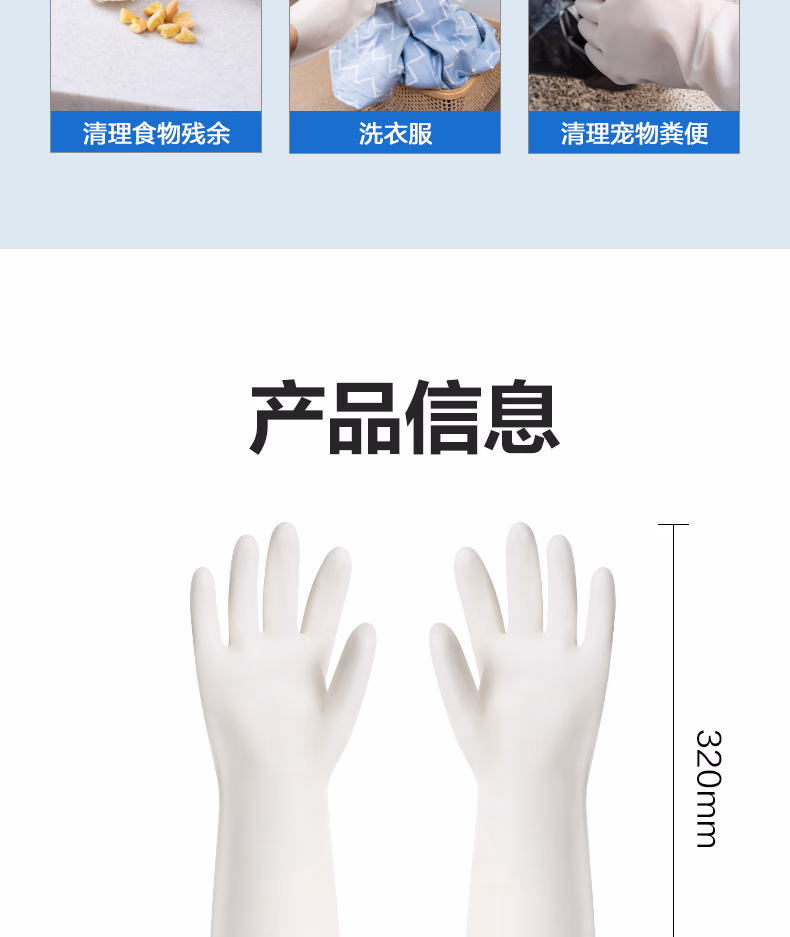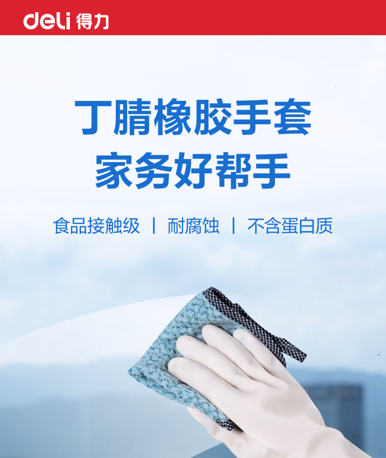 包装清单  :   得力(deli)洗碗清洁家务手套乳/橡胶 食品级耐腐蚀耐磨防水防滑护手320mmL码
