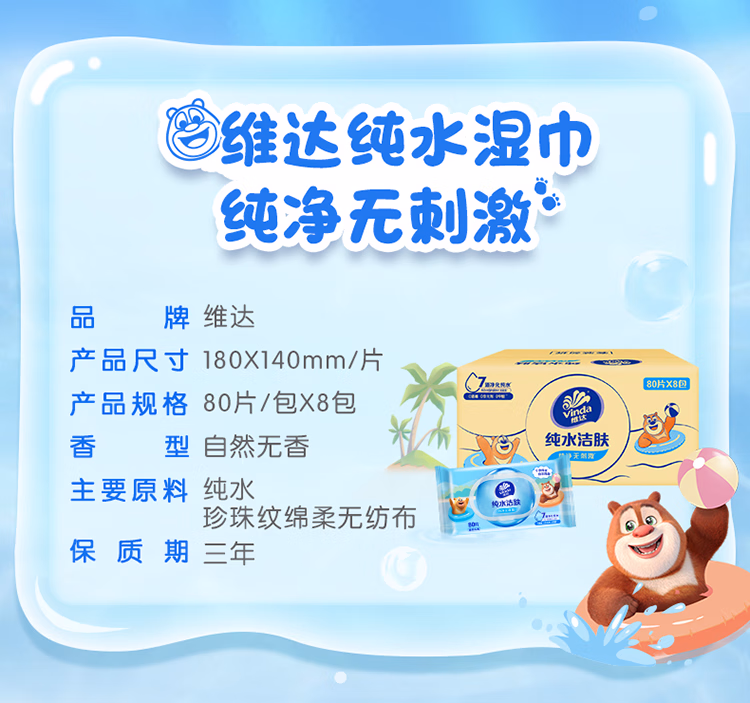 包装清单  :   维达(Vinda)婴儿湿巾 熊出没联名 婴儿手口屁屁专用 家庭囤货 湿纸巾80片*8包