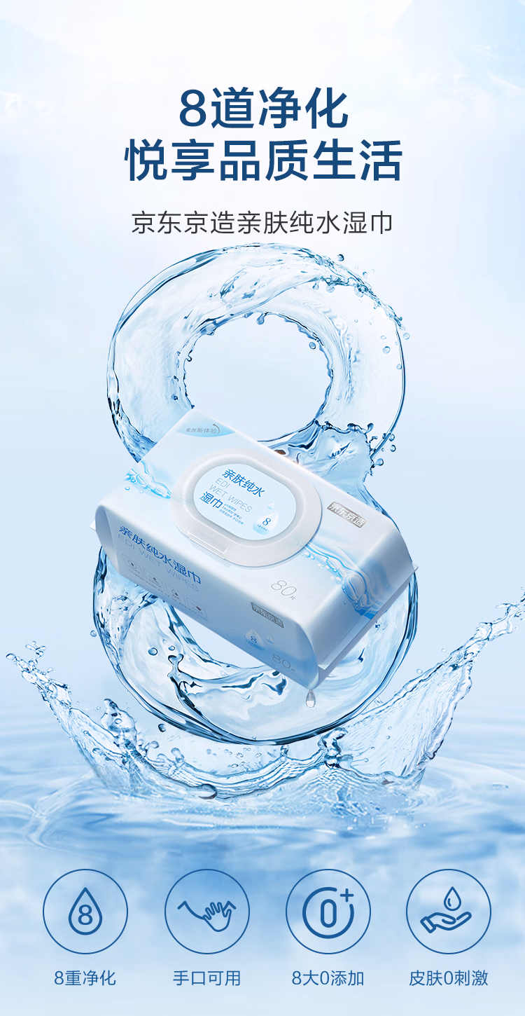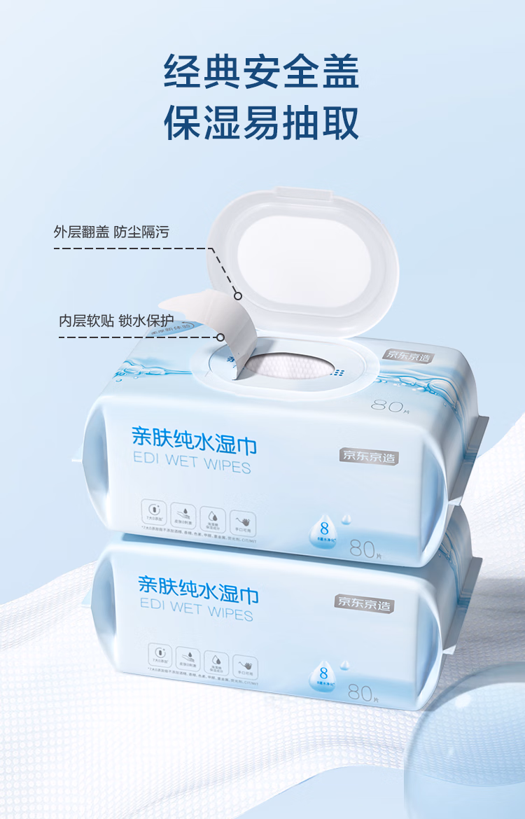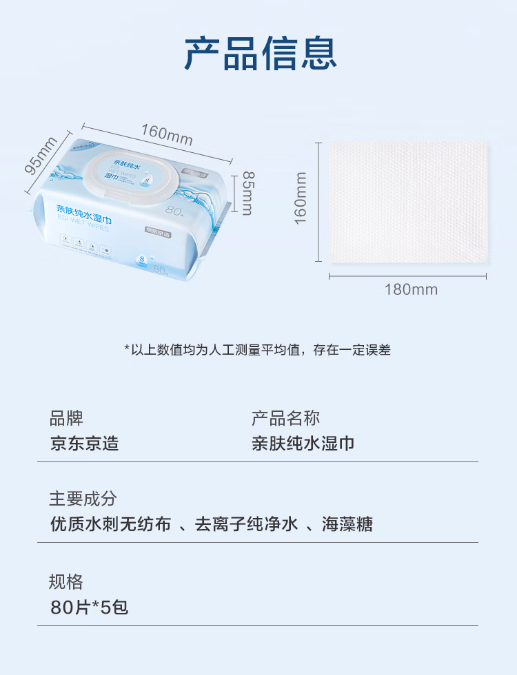 包装清单  :   京东京造EDI纯水湿巾亲肤80抽*5包 婴儿手口湿巾纸 升级加厚加大湿纸巾