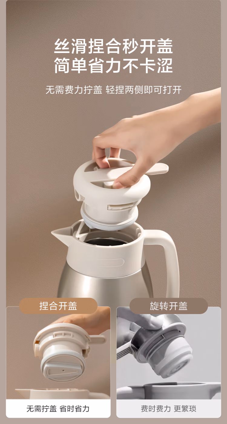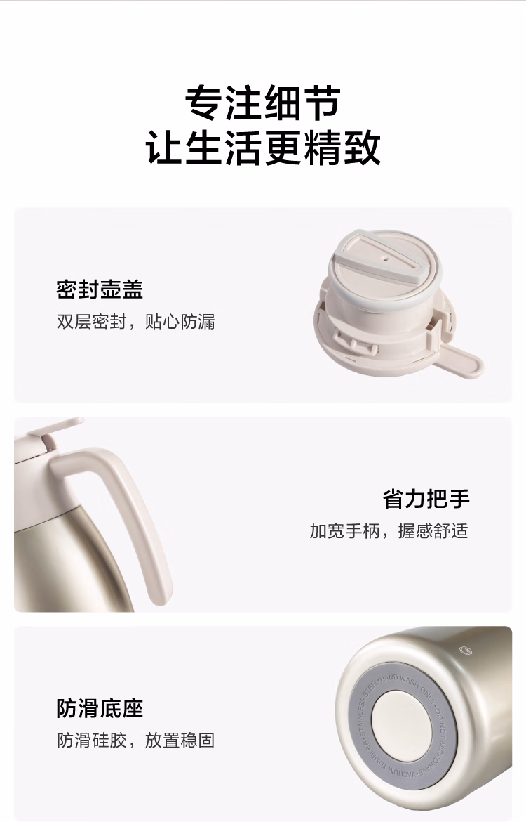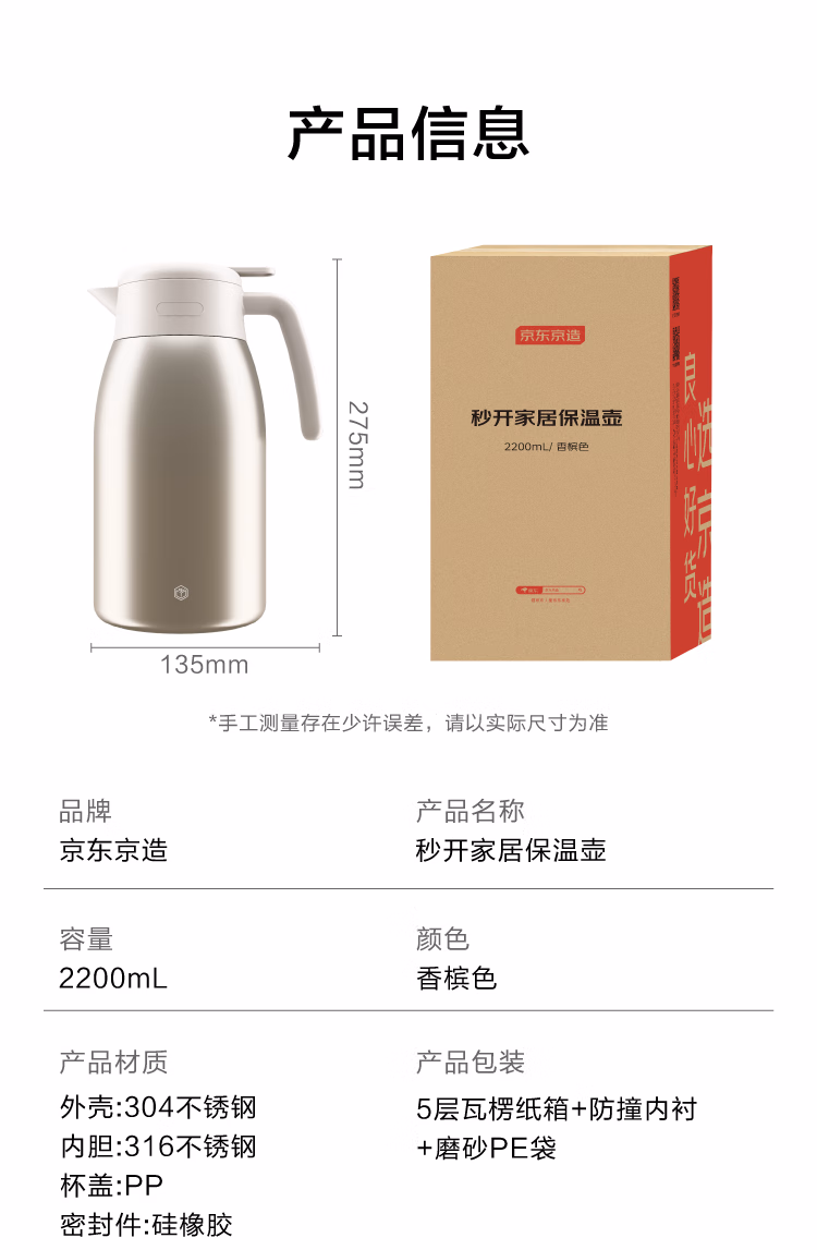 包装清单  :   京东京造保温壶 家用大容量暖热水瓶户外316不锈钢【单手开盖】金色2.2L