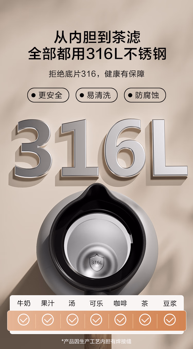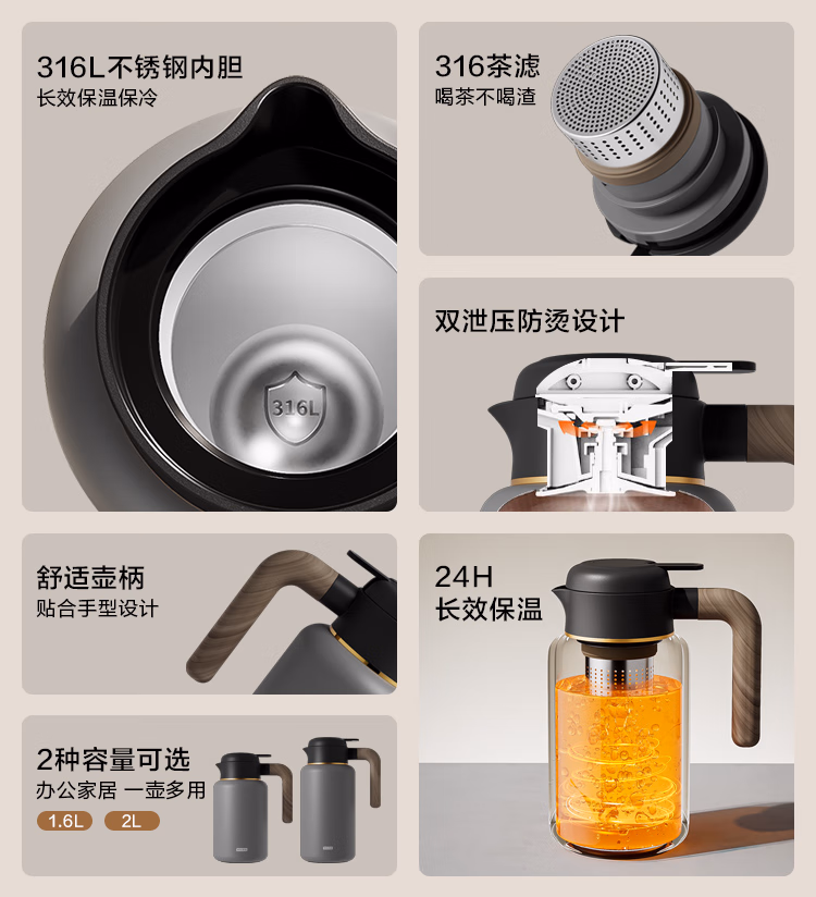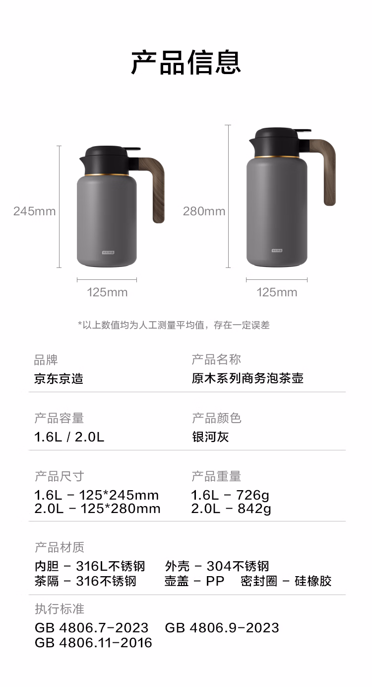 包装清单  :   京东京造 茶壶 原木系列煮茶具闷茶烧水养生茶壶 316不锈钢银河灰2.0L