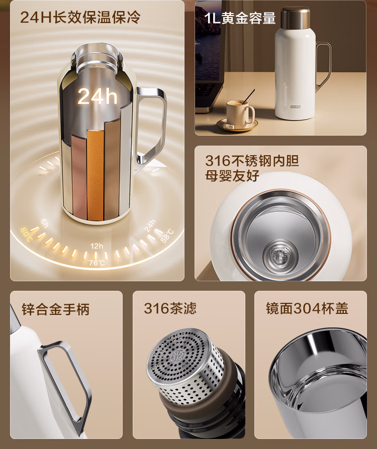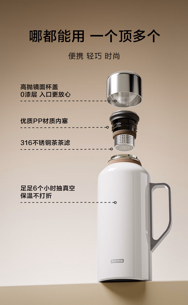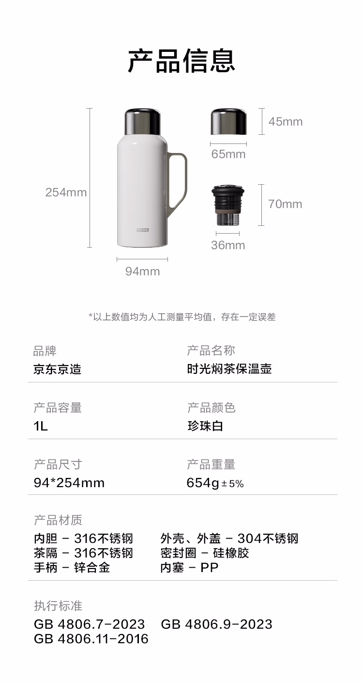 包装清单  :   京东京造 茶壶 时光煮茶具闷茶烧水茶壶养生保温瓶 316不锈钢珍珠白1L
