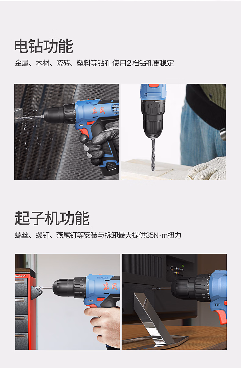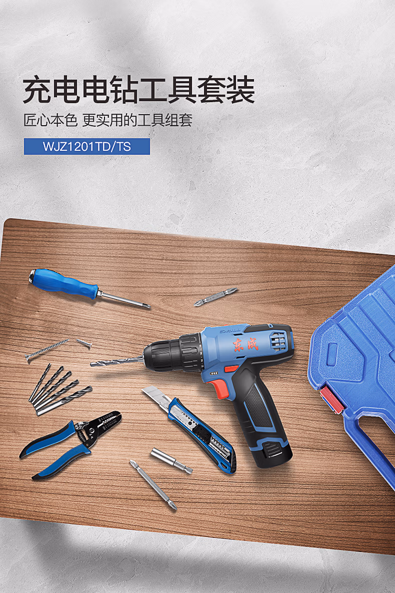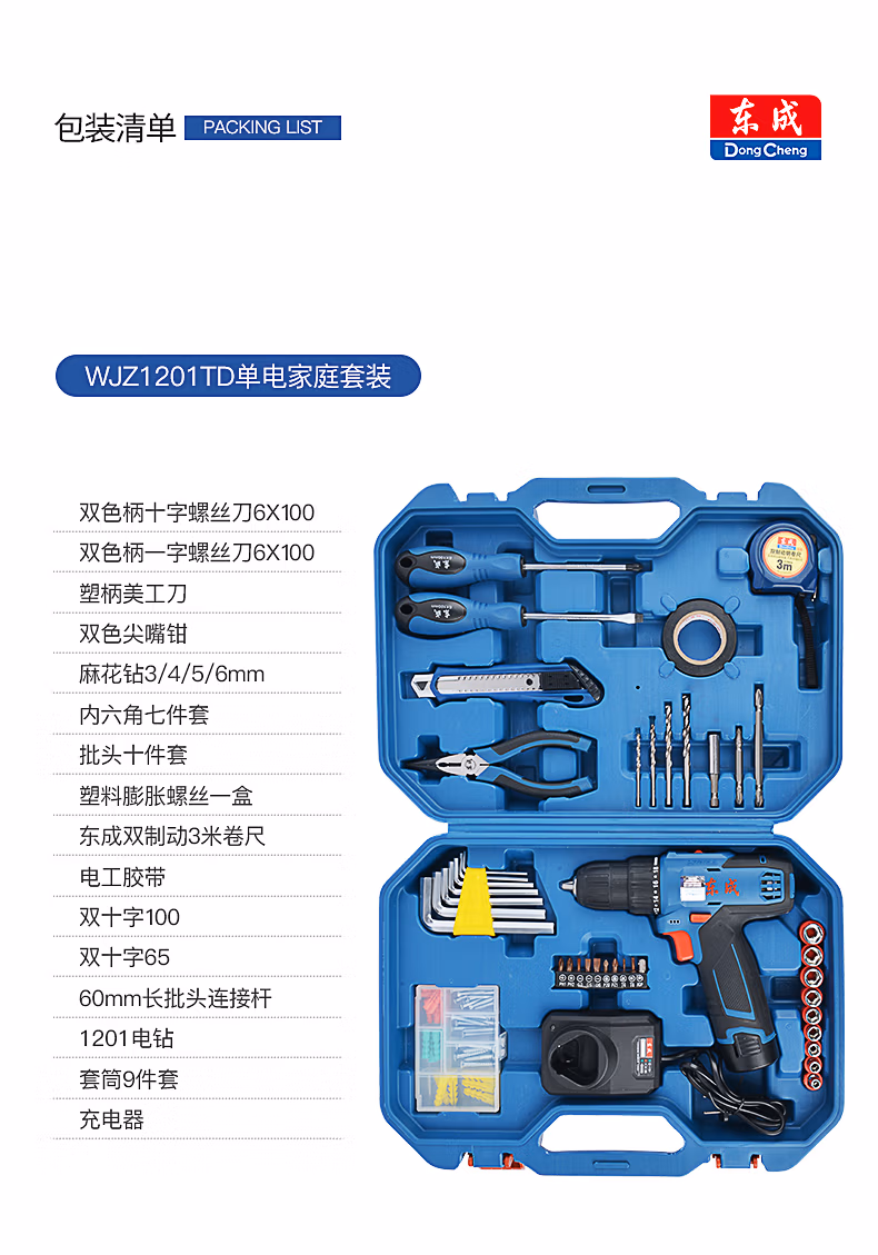 包装清单  :   东成锂电钻WJZ1201TD充电式手电钻电动螺丝刀套装家用工具箱