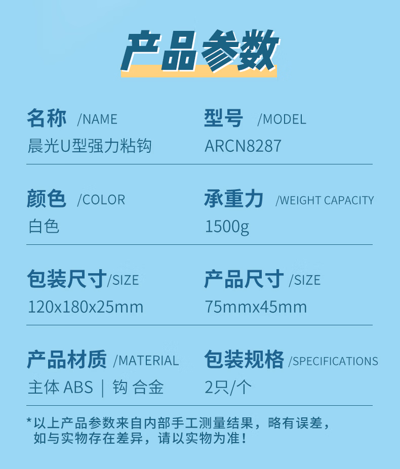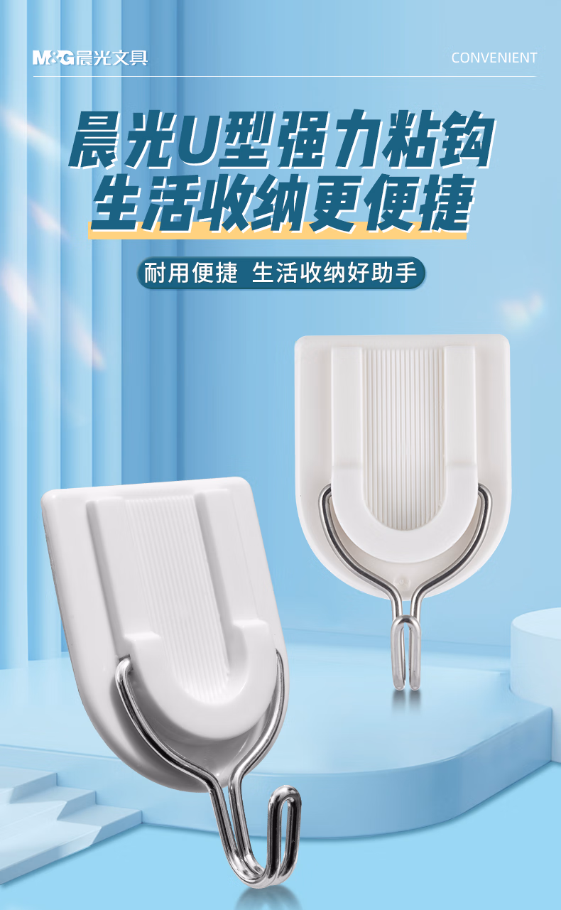 包装清单  :   晨光(M&G)挂钩强力粘胶墙壁挂物无痕免打孔厨房卧浴室门后挂钩墙上粘钩 U型1.5kg 2只装 ARCN8287