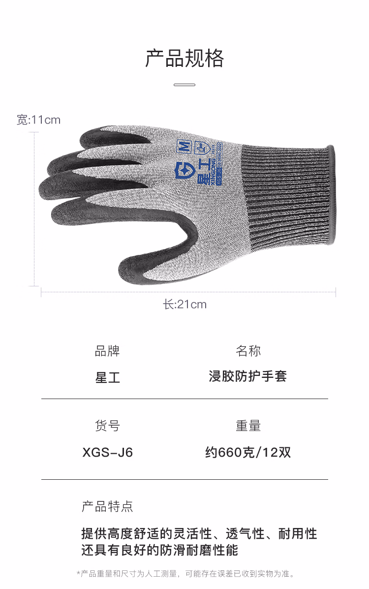 包装清单  :   星工(XINGGONG) 浸胶劳保线手套 防滑耐磨半挂橡胶皮工地防护手套 12付XGS-J6