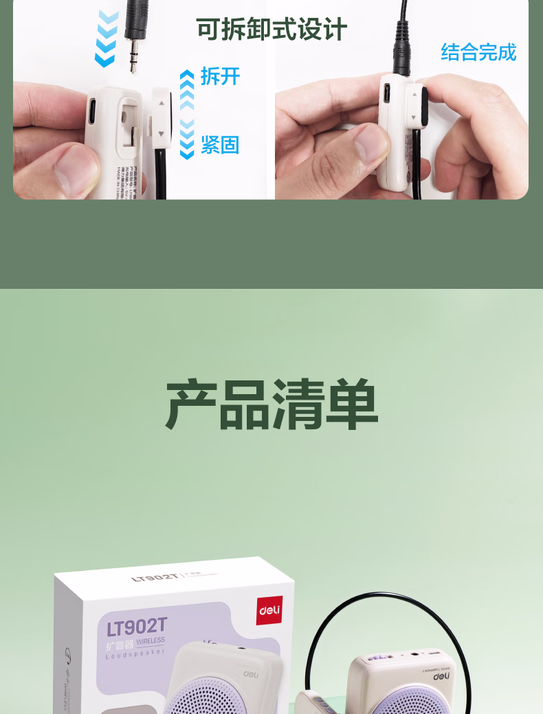 包装清单  :   得力(deli)5W小蜜蜂扩音器教师专用老师上课专用户外无线麦克风扩音喇叭大功率扬声器无线头戴款