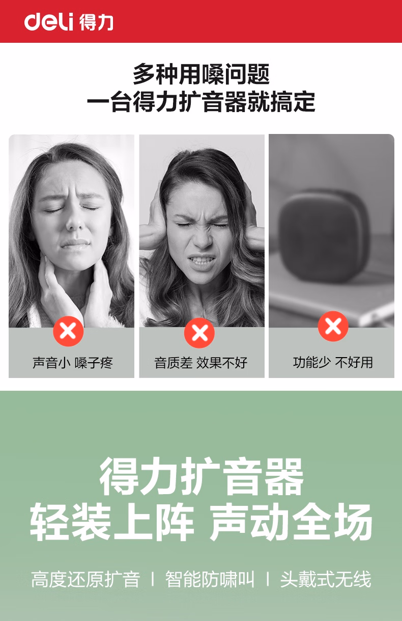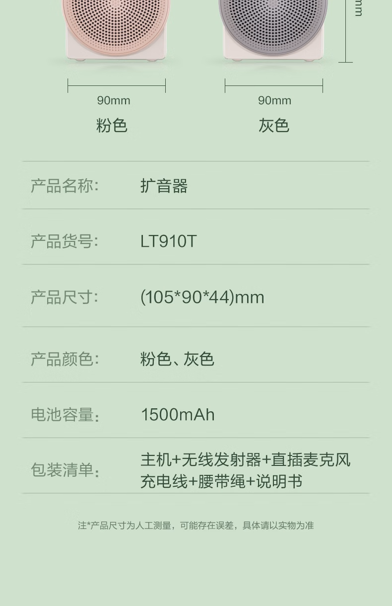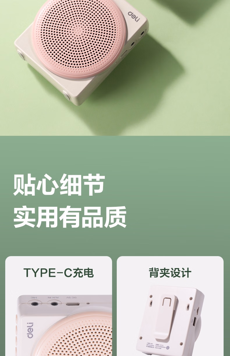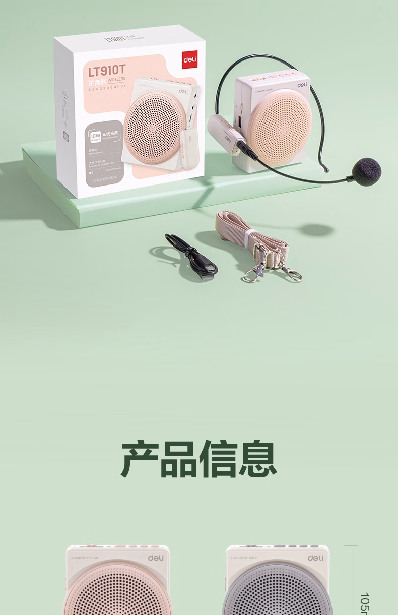 包装清单  :   得力(deli)10W小蜜蜂无线扩音器音箱大音量小喇叭腰挂麦克风导游蓝牙插卡便携讲课喊话器教师专用神器粉