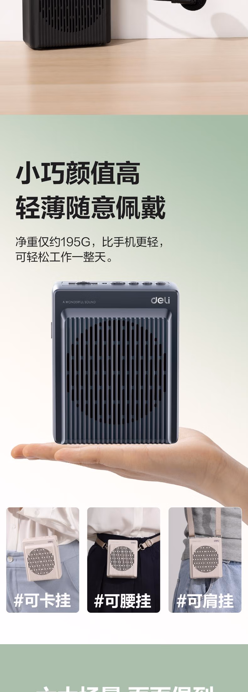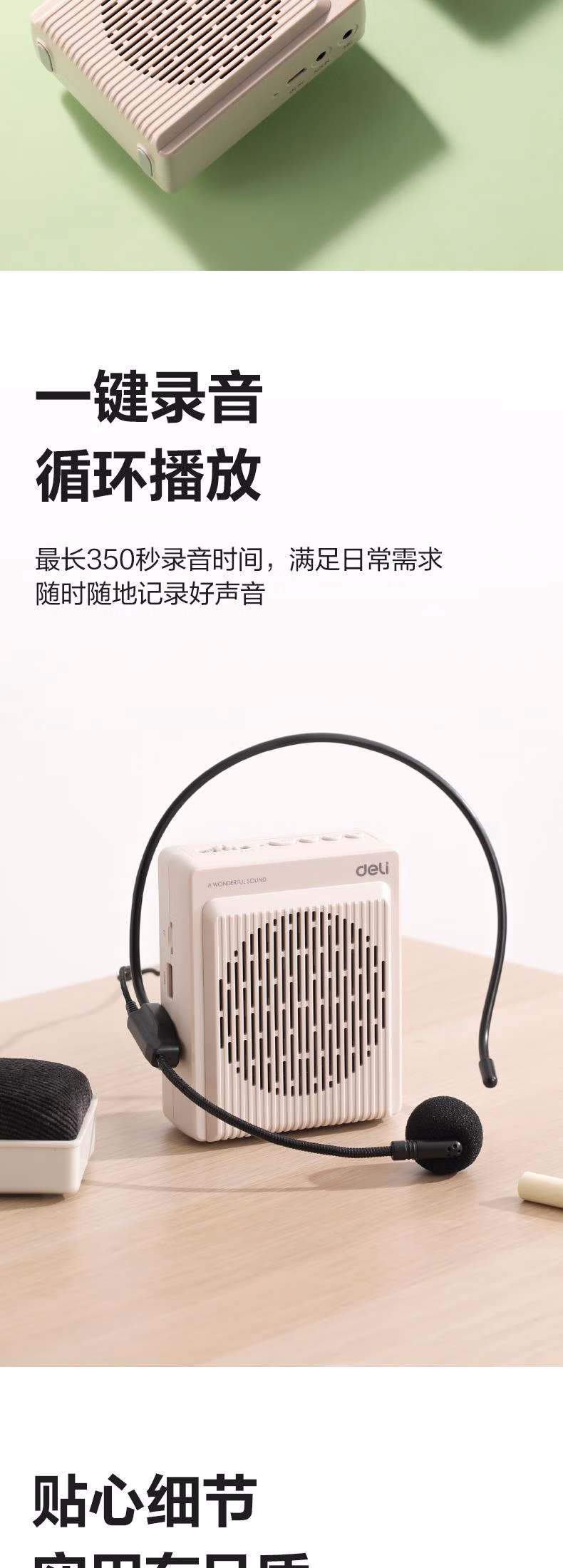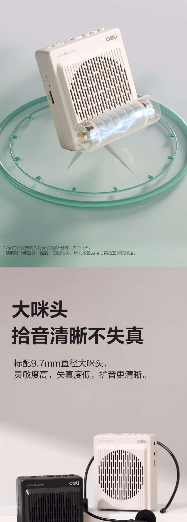包装清单  :   得力(deli)13W小蜜蜂有线款扩音器教师专用音箱小喇叭腰挂麦克风录音蓝牙插卡导游便携喊话器生日礼物灰